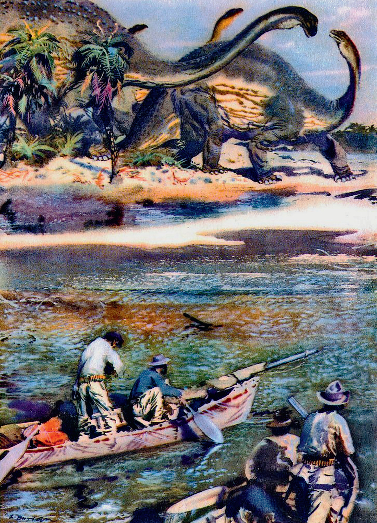 Динозавры Плутонии. Иллюстрация Зденека Буриана к чешскому изданию романа Владимира Обручева «Плутония». 1956 год. Источник: fantlab.ru