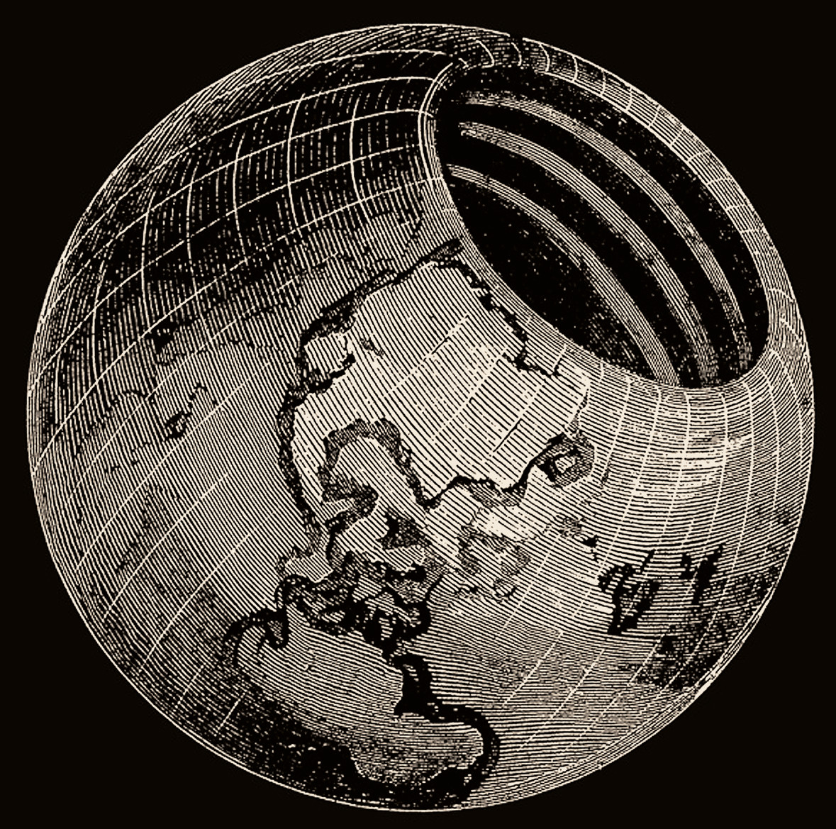 Полая Земля, согласно теории отставного капитана Джона Кливза Симмса-младшего. 1878 год. Иллюстрация из книги: Symmes’s Theory of Concentric Spheres: Demonstrating That the Earth is Hollow, Habi-table Within, and Widely Open About the Poles, Compiled by Americus Symmmmes, from the Wri-tings of his Father, Capt. John Cleves Symmmmes. Louisville, KY. Printed by Bradley & Gilbert, 1878. Источник: babel.hathitrust.org