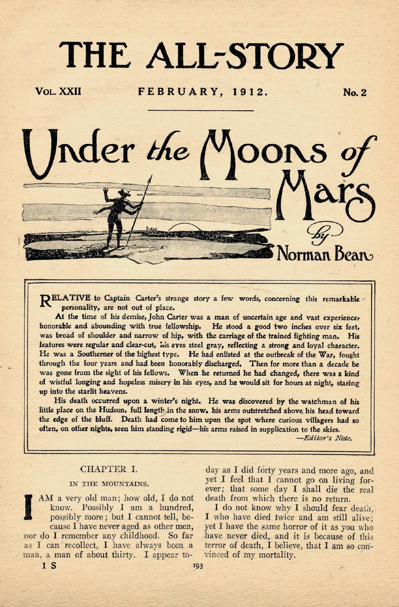 Летом 1911 года втайне от семьи Берроуз начал писать роман о приключениях капитана-кавалериста Джона Картера на Марсе, куда тот попадает чудесным образом и сразу ввязывается в местное военное противостояние, побеждает всех врагов и женится на принцессе Дее Торис. Текст под названием «Под лунами Марса» (Under the Moons of Mars) публиковался на страницах журнала «Все истории» (All-Story Magazine) с февраля по июль 1912 года. Чтобы не испортить деловую репутацию, Берроуз выбрал псевдоним «Нормальный Бин» (Normal Bean), но типографский наборщик счёл, что это опечатка, и исправил на «Норман Бин» (Norman Bean). Книжное издание «Принцесса Марса» (A Princess of Mars) увидело свет в 1917 году — в то время автор уже обрёл популярность и мог больше не прибегать к псевдониму.
