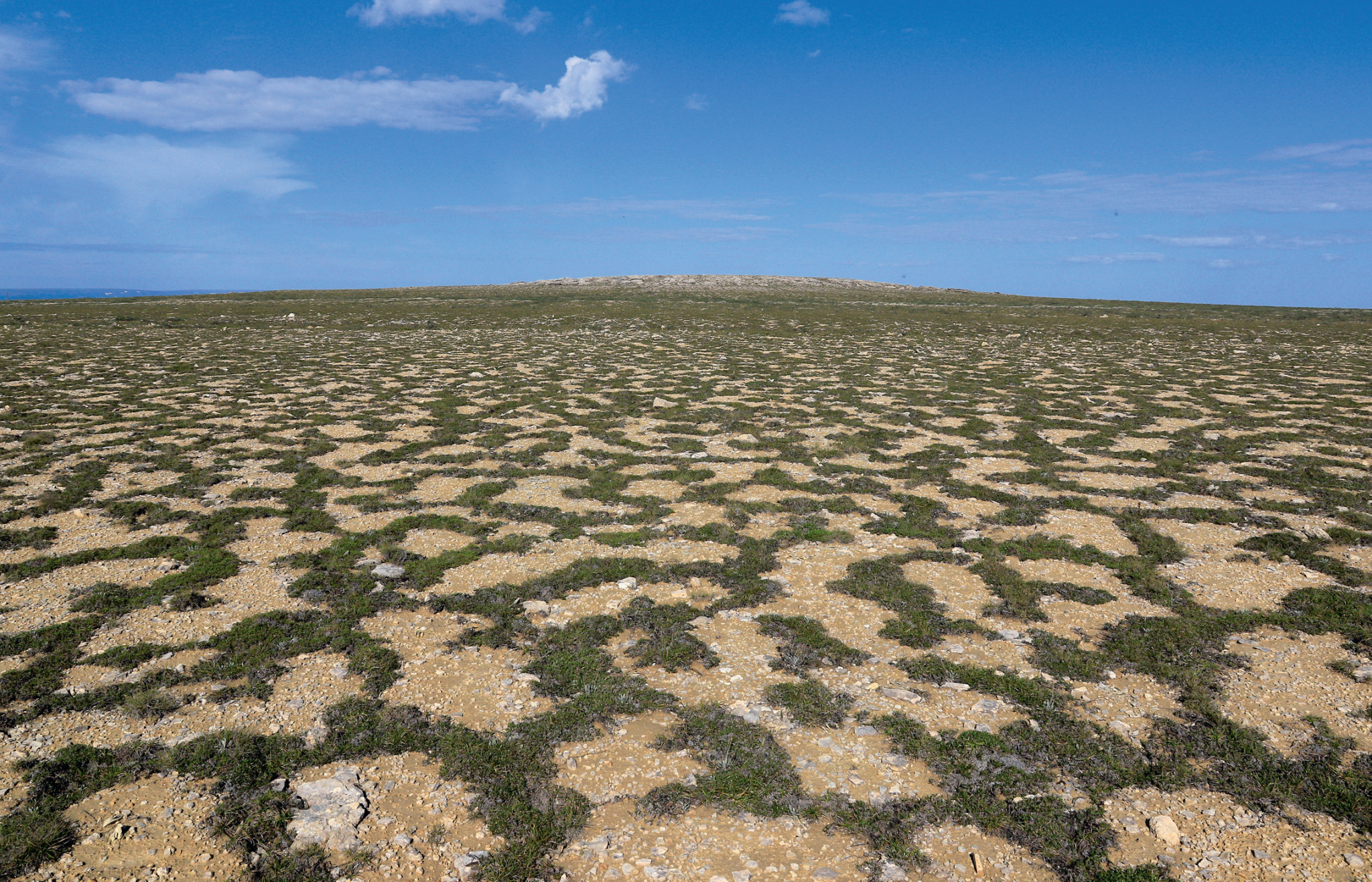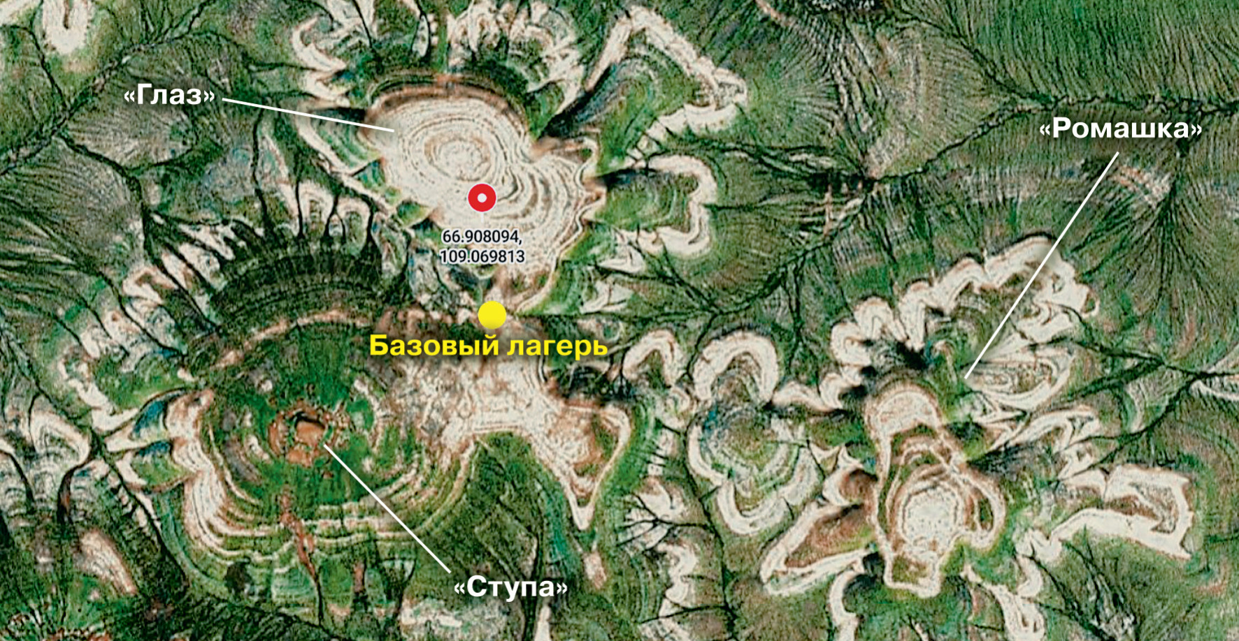 Первым делом мы посетили объект, который был ближе и доступнее всего. Он представлял собой почти плоскую гору куполообразной формы. Периодически, на пути к слабо выраженной вершине, приходилось пересекать довольно широкие каменистые гряды, состоявшие из обломков осадочных пород. Они тянулись в обе стороны, явно образуя концентрические окружности вокруг купола, но масштаб горы не позволял представить себе гигантский узор, сложенный этими образованиями. Зато когда мы достигли вершины купола и в воздух взвились взятые с собой квадрокоптеры, первые же фотографии с высоты заставили ахнуть от восхищения. Мы находились прямо в центре зрачка гигантского глаза! Узкие и тёмные радиальные линии (высохшие водотоки) лишь добавляли сходства с роговицей.