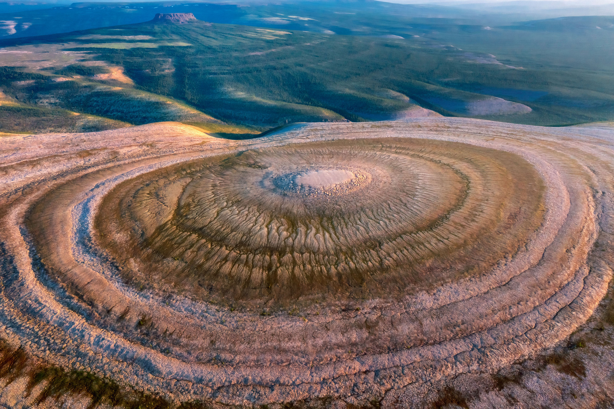 Представьте теперь этот слоёный пирог, периферию которого «слизала» эрозия. Края горизонтальных слоёв обнажились на торцах и образовали заметные концентрические окружности. «Зрачок» же представляет собой плоский остаток самого верхнего сохранившегося пласта.