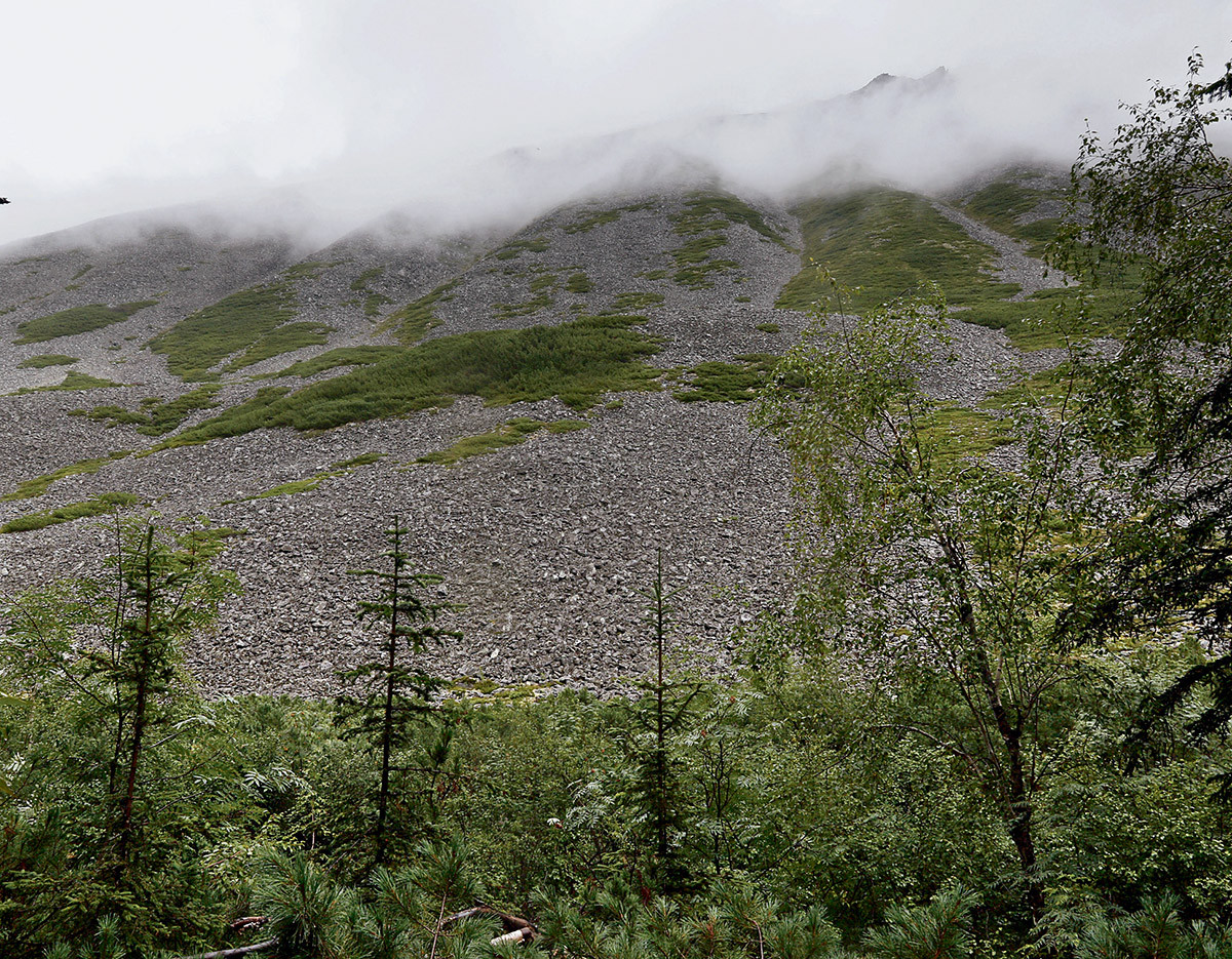 Дорога пролегает по отвалам грунта, промытого некогда золотодобывающей драгой. То и дело ныряет в речки и канавы. Нависшие деревья нещадно стегают по стеклу. Три часа вверх-вниз по сопкам. Старенький «Урал» кряхтит, но едет уверенно. До цели оставался всего километр, когда неожиданно машина по оси погрузилась в разжиженную дождями болотину… Общими усилиями ближе к вечеру её всё же удалось вызволить. Отправив счастливого водителя обратно домой, взваливаем тяжёлые рюкзаки на плечи и двигаемся дальше.