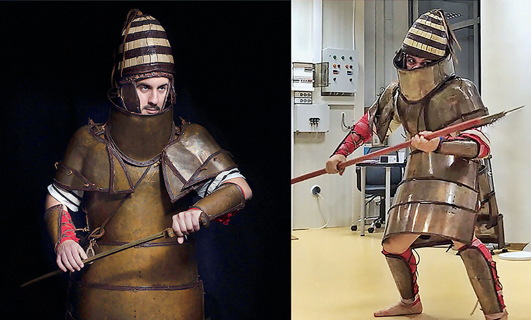 Рост участников инсценировки составлял в среднем 173 см, вес — около 75—82 кг. Эксперименты заняли два месяца. В боях постоянно регистрировались частота пульса, температура. Временами использовались портативные газоанализаторы, записывающие состав вдохов и выдохов участников, что позволило оценить энергетические затраты на каждый вид боевой активности. Броню изготовили студенты и сотрудники факультета металлообработки в Борнвильском колледже искусств (Бирмингем, Великобритания). Использовали сплав из 95% меди и 5% цинка, что наиболее близко к оригинальной бронзе из раскопок. Каждую из пластин брони сформировали точно по размерам и форме оригинальной и снабдили кожаными ремнями для ношения. Но шлемы изготовили из пластмассы. Общий вес снаряжения достиг 23,32 кг, тогда как вес остатков оригинала, который сохранился далеко не полностью, составлял 1,8 кг. За 3500 лет большая часть металла окислилась и исчезла в почве, а ремни просто сгнили. В качестве вооружения солдатам выдали копии древних мечей, правда, лезвия и острия затупили для минимизации травм. Меч имел длину 85 см и весил вместе с деревянной ручкой 1,2 кг, то есть был немного тяжелее оригинала. Второй вид вооружения — копьё, которое можно было бросать или ударять им противника. Древко из ясеня, медный наконечник весом 406 г (его также затупили). Кроме того, бойцы могли бросать среднего размера камни (23 на 15 см, вес 1,3 кг).