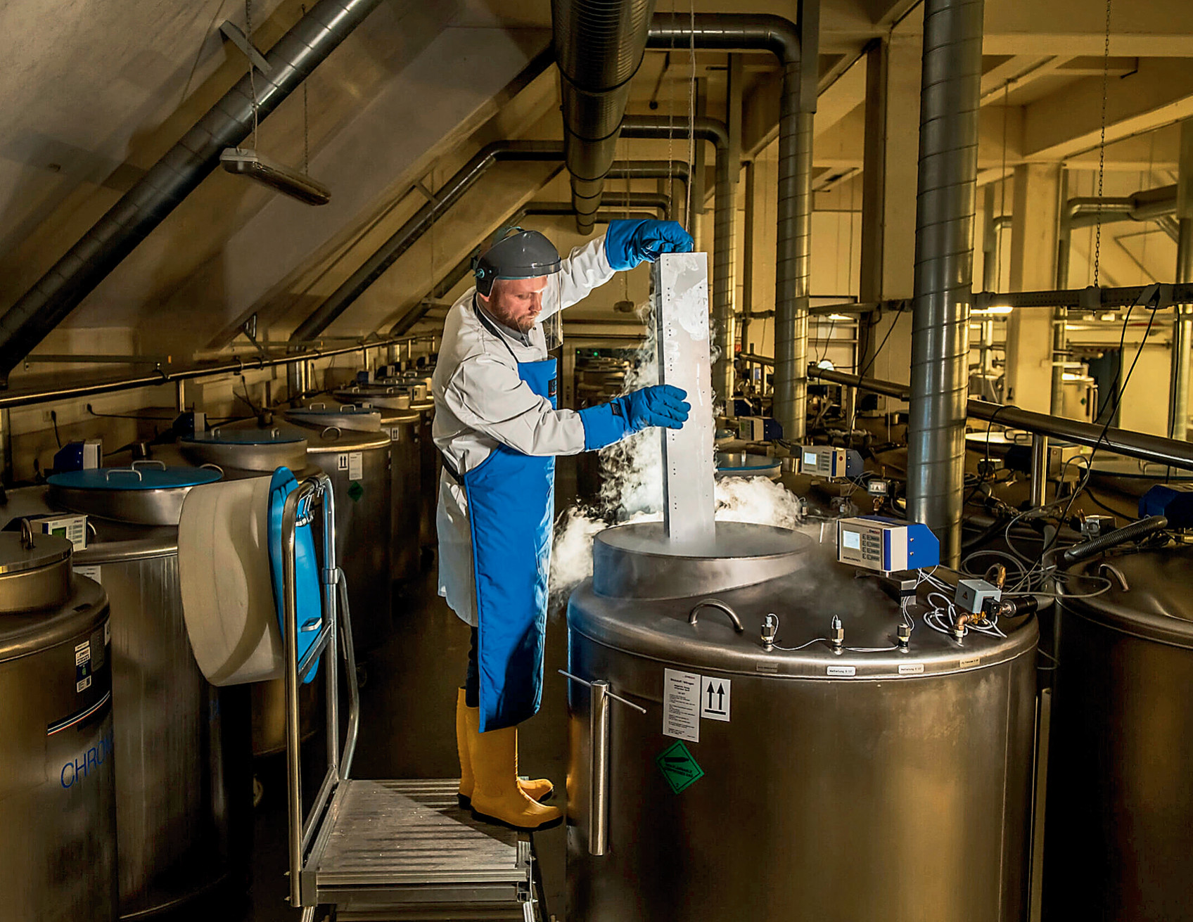 В бункере поддерживается температура не выше 12°С, так что сотрудники довольно тепло одеты. Но в хранилищах, криотанках — 45-и цилиндрах из хромированной стали высотой в половину человеческого роста — царит температура –160°С, которую обеспечивает жидкий азот на дне каждого цилиндра. Аналогичное, самое первое в мире, хранилище в Стокгольме претерпело катастрофу в конце 2023 года, когда на Рождество неожиданно отключилось энергоснабжение и это заметили только через пять дней. Не сработала система аварийных предупреждений по SMS. Пропали результаты многолетних исследований, экономический урон составил около 45 млн евро. Но в Мюнстере такая ситуация сложиться не может. Во-первых, криотанки, устроенные по принципу термоса, могут сохранять свою температуру от 10 до 14 суток. Во-вторых, налажена многоуровневая система аварийного предупреждения: в случае аварии сработает не только SMS, но и электронная почта, и придёт голосовое сообщение на телефон каждому сотруднику.