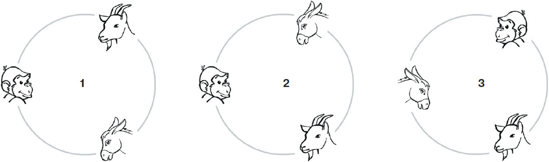 * Если по команде «музыканты» переместятся в одном направлении и каждый займёт место соседа, положение всех троих относительно друг друга не изменится. Расположения, полученные одно из другого поворотом, считаются одинаковыми. Различными будут расположения, при которых соседи Мартышки меняются местами.