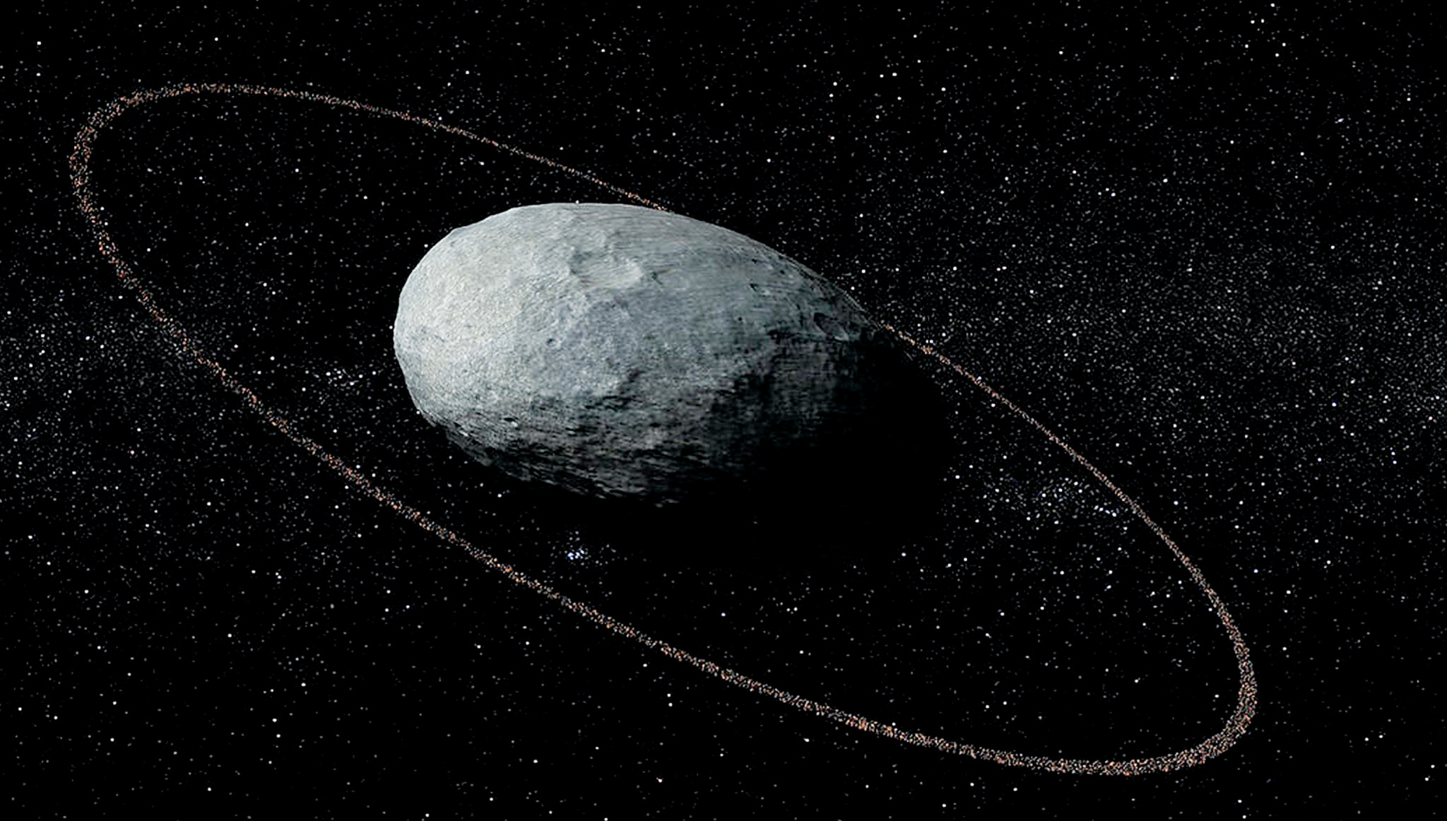 Это, пожалуй, самый странный объект в поясе Койпера из всех, что астрономам довелось увидеть. Карликовая планета настолько мала, что её сил гравитации не хватило, чтобы сформировать сферу. Быстрое вращение придало ей продолговатую (эллипсоидную) форму, чем-то напоминающую камень морской гальки. Однако, несмотря на свои скромные размеры (длина — 2322 км, ширина — 1700 км и высота — 1138 км), Хаумеа имеет два спутника и даже кольцо.
