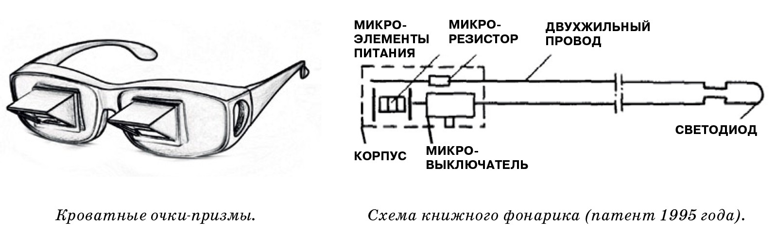 Сейчас существует множество книжных светильников. Один из них, запатентованный в 1995 году как лампа, экономящая заряд элементов питания, долго пользовался большим спросом. Лампа работает следующим образом: включается микровыключатель и ток от микроэлементов питания поступает через микрорезистор и провод на светодиод (см. рисунок ниже).