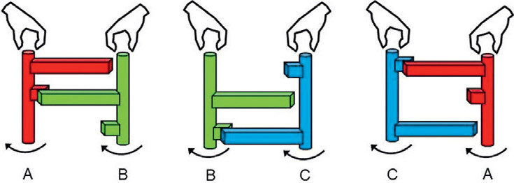 Нетранзитивные конструкции с рычагами. Перейдём к другому типу простых механизмов — рычагам. На рисунке показаны конструкции с креплением на валу длинных и коротких рычагов на разных уровнях. При равном усилии соревнующихся участников, приложенном к валам, конструкция А «пересиливает» В, В «пересиливает» С, С «пересиливает» А. Почему так происходит, читатель может подумать сам.