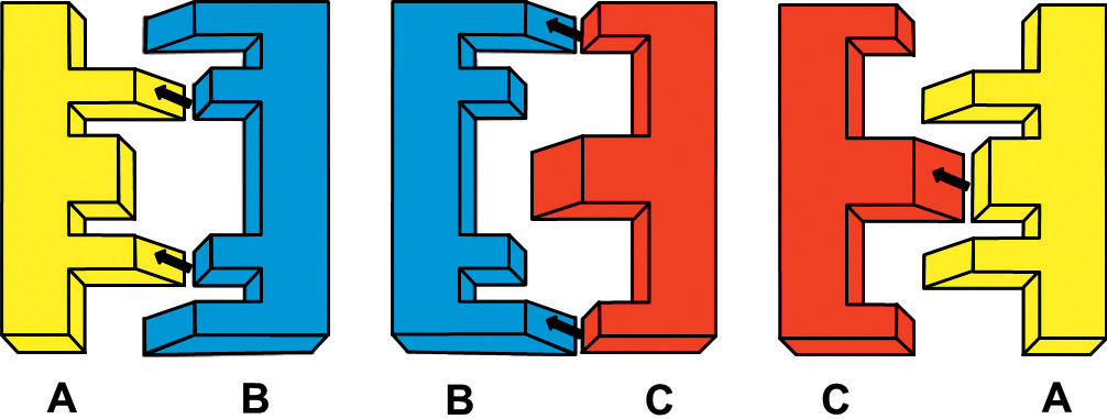 Нетранзитивные шестерни. Шестерни — ближайшие родственники рычагов в отношении способа передачи усилия. На рисунке показаны конструкции с бóльшими и меньшими шестернями, закреплёнными на валах на разных уровнях (так же, как в двойных рычагах). При попарных соединениях конструкция А вращается быстрее В в паре А-В, В вращается быстрее С в паре В-С, С вращается быстрее А в паре А-С. Если соединить все три конструкции вместе, вращаться они не смогут — их заклинит.