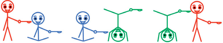 Нетранзитивные «мартышки». Посмотрев на рисунок, можно убедиться, эти три мартышки кормят друг друга нетранзитивным образом (красная — синюю, синяя — зелёную, а та — красную).