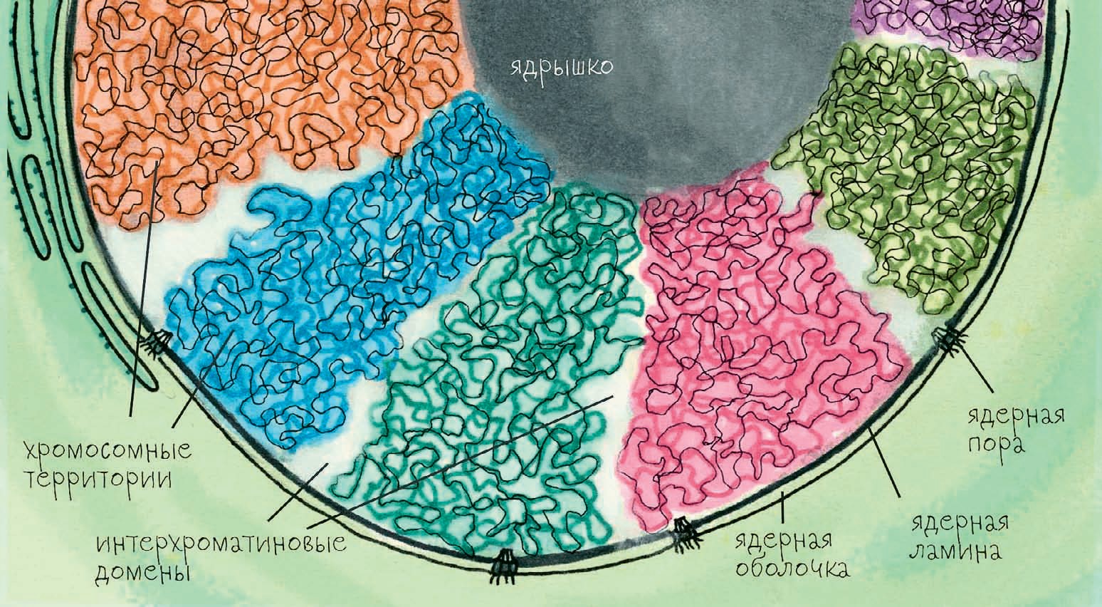 Хроматиновые глыбки окружены интерхроматиновым компартментом — ядерным матриксом с функциональными агрегатами, большими молекулярными структурами, которые заняты синтезом РНК и её последующей обработкой — редактированием. Интерхроматиновое пространство можно рассматривать как сеть тоннелей, начинающихся от открывающихся в цитоплазму ядерных пор и пронизывающих всё ядро. Крупные белковые комплексы не могут проникнуть внутрь хроматиновых глыбок, так что вся ядерная молекулярная работа происходит именно в этих интерхроматиновых тоннелях. В тоннели же обращены ацетилированные (то есть активные) участки хроматина — они покрывают глыбки «ворсом» из петель ДНК. Ненужная информация контактирует сама с собой внутри плотно упакованных глыбок, а нужные фрагменты генома выведены из глыбок наружу, в интерхроматин, где они могут контактировать друг с другом и с белками, обслуживающими нужную генетическую информацию. Таким образом клетке удаётся без особых затрат времени и сил поддерживать свой геном в порядке даже после деления.