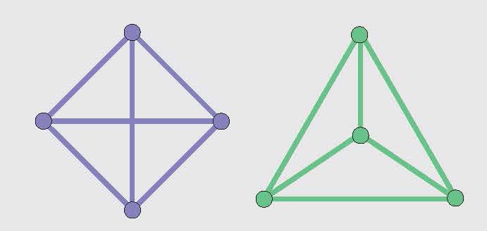 Приведём наглядный пример. Представим себе нескольких человек — они будут вершинами графа. Если двое из них знакомы, будем считать, что их связывает ребро. Изображать граф можно разными способами хотя бы потому, что люди, например, могут находиться в разных местах. Граф будет получаться один и тот же, даже если картинка меняется. Например, если четыре человека знакомы друг с другом, то граф, соответствующий этой ситуации, можно изобразить разными способами: как квадрат с диагоналями и как треугольник с точкой внутри (рисунок слева). Картинки получаются совершенно разными, но граф, изображённый на них, один и тот же. Это полный граф с четырьмя вершинами (полными называются графы, в которых присутствуют все возможные рёбра).