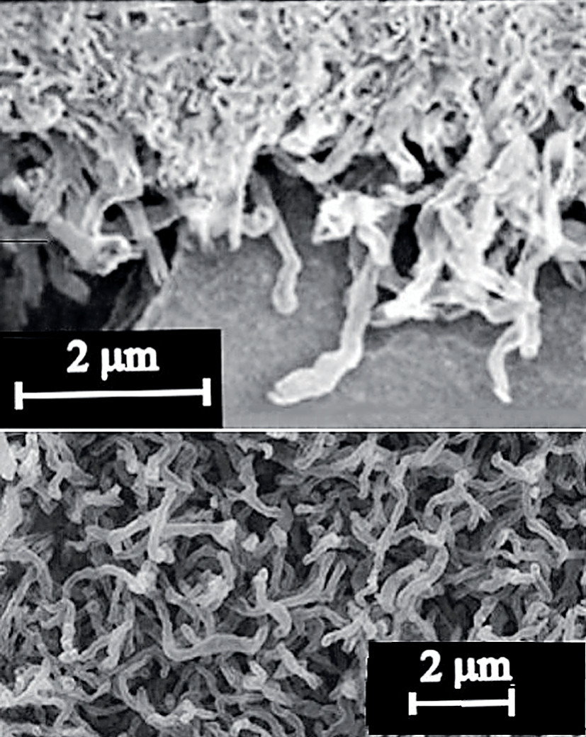 Научная группа, состоящая из сотрудников Физико-технического института им. А. Ф. Иоффе и ещё восьми научных организаций (все — Санкт-Петербург), обнаружила, что это не просто поры, а извилистые трубки, ведущие вглубь слоя кремния, как бы растущие сверху вниз. На фотографиях, полученных в сканирующем электронном микроскопе, видно, что трубки углубляются на 4 мкм при своём диаметре 0,1—0,2 мкм (фото вверху) и образуют довольно плотный ковёр (фото внизу). Исследователи изучили, как всё это происходит на разных кристаллографических плоскостях кремния, как влияет время травления. А в дополнение проверили на биосовместимость со стволовыми клетками и убедились, что она есть.