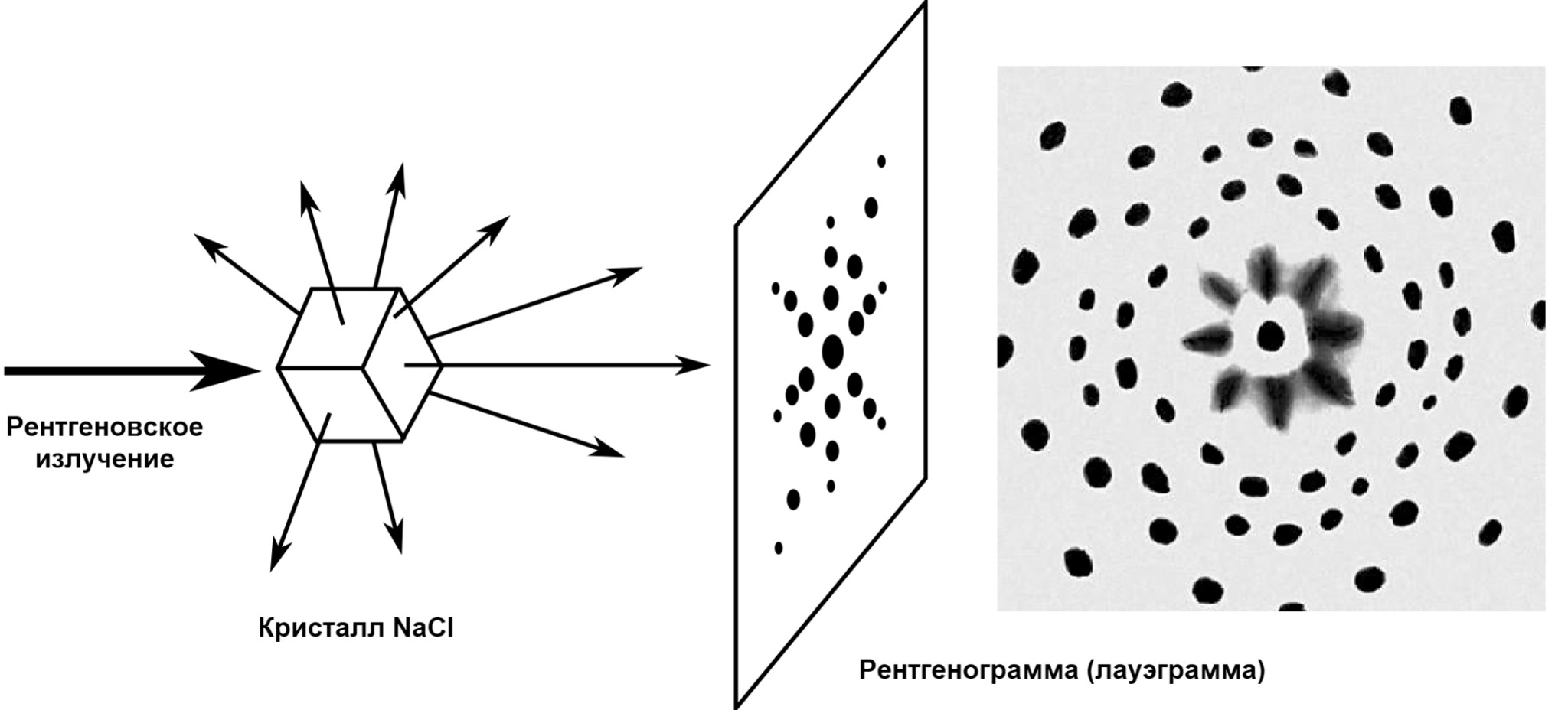 Тут и пришла на помощь кристаллическая решётка, имеющая «щели» нужного размера. Замечательная идея использовать кристалл в качестве пространственной дифракционной решётки для рентгеновского излучения в 1912 году пришла в голову немецкому физику Максу фон Лауэ. Два его студента — Вальтер Фридрих и Пауль Книппинг эту дифракцию обнаружили, и для рентгеновского излучения задача была решена: волновой характер установлен, длины волн измерены. Стоит отметить, что благодаря двум Уильямам Брэггам, отцу и сыну, этот метод превратился в основу рентгеноструктурного анализа — мощнейшего метода исследования структуры кристаллов, а также рентгеновской спектроскопии. За это Лауэ и Брэгги стали лауреатами Нобелевской премии в 1914 и 1915 годах.