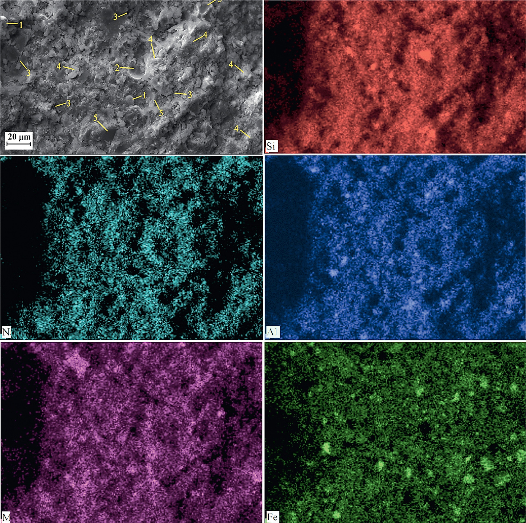 Карты распределения элементов, полученные для образца AACNS-80 (80% шлака, 20% золы уноса). AACNS-80 имеет пониженную пористость по сравнению со связующими, изготовленными из чистой золы или чистого плавильного шлака, что объясняется повышенной реакционной способностью и большим гелеобразованием. Гель заполняет поры и связывает непрореагировавшие частицы, создавая более компактную структуру. 1 — непрореагировавшие или частично прореагировавшие частицы золы уноса; 2 — полости, образованные воздухом, попавшим в пасту; 3 — трещины и пустоты; 4 — гель; 5 — непрореагировавшие или частично прореагировавшие частицы шлака. Фото из статьи: Kalinkin A. M., Kalinkina E. V., Kruglyak E. A., Ivanova A. G. Alkali-activated binders from copper–nickel slag and fly ash: a synergistic effect. Minerals. 2025; 15(12):1297.