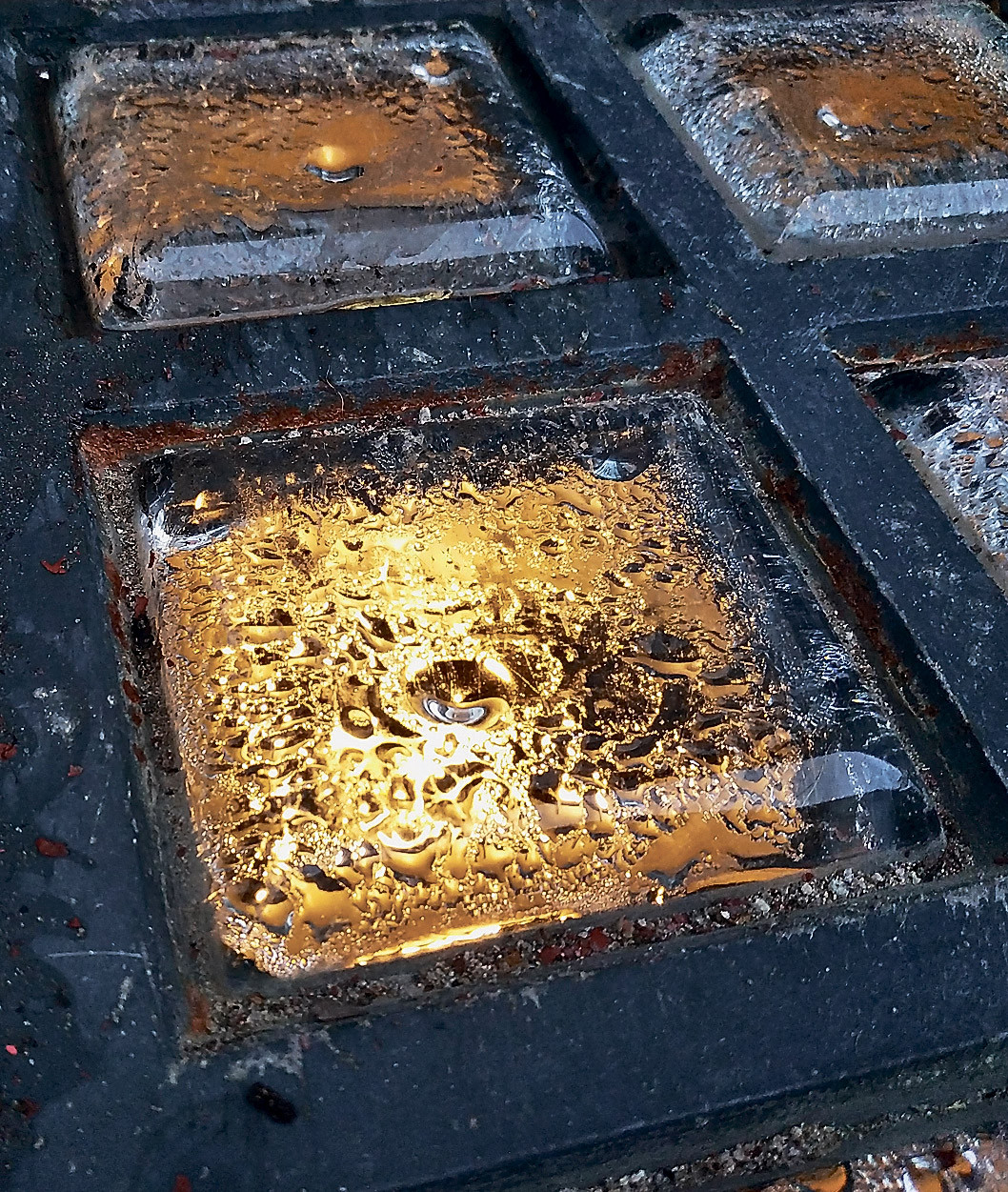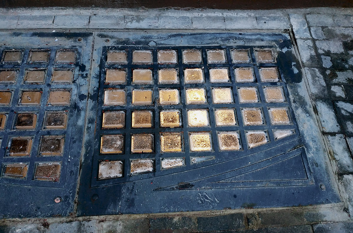 Оглянемся вокруг. Вместо бесконечных столичных пробок улицы заполнены снующими туда-сюда конными экипажами. Значит, мы попали как минимум в первое десятилетие ХХ века, если не раньше. На месте здания, у которого началось наше путешествие в прошлое, идёт большая стройка. Двое рабочих несут ту самую чугунную решётку, ещё без следов ржавчины и с целыми прозрачными стеклянными вставками в форме небольших призм. Она больше похожа на деталь какого-то замысловатого оптического прибора. Прямо на наших глазах решётку укладывают на тротуар над проёмом, сквозь который видны очертания большого подвального помещения. Один из рабочих даже попрыгал на ней, демонстрируя второму прочность конструкции. Подойдя ближе, мы увидели отштампованную в чугуне надпись «Luxfer».