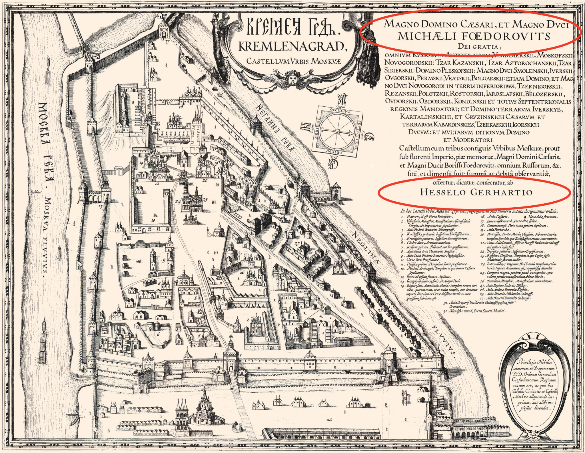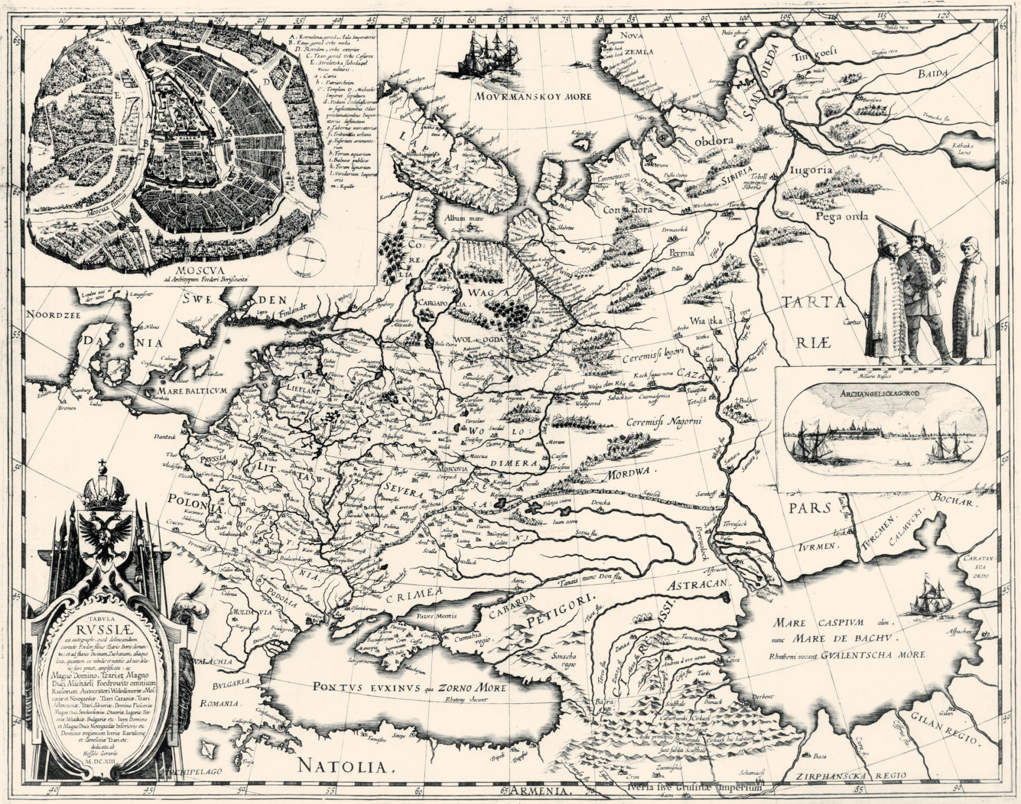 Когда известие об избрании нового царя достигло Амстердама, торговые люди Нидерландов поняли, что пришло время действовать. Можно предположить, что, рассчитывая добиться конкурентных преференций в торговле над своими главными соперниками — англичанами, они решили завоевать расположение московских властей, сделав молодому царю и его вельможам невиданный подарок: комплект гравированных печатных карт Московского государства. У англичан в то время не было ни возможностей, ни сравнимых по классу мастеров, чтобы ответить тем же Гессель Герритц (Hessel Gerritsz, 1581— 1632) — искусный гравёр и автор исследовательских трудов о северных землях, написанных на нидерландском и французском языках, — недаром пользовался репутацией выдающегося картографа. В течение 1613 года он на основании доставленных Исааком Массой материалов и других находившихся в его распоряжении источников подготовил и выгравировал три карты Московского государства в формате фолио, то есть в полный печатный лист: генеральную карту страны с врезкой плана Москвы — Tabula Russiae, а также детальный план Москвы и парный ему план Московского Кремля. И генеральная карта, и детальные планы были посвящены Великому государю Михаилу Фёдоровичу. Эти карты считаются жемчужиной нидерландской и мировой картографии7.