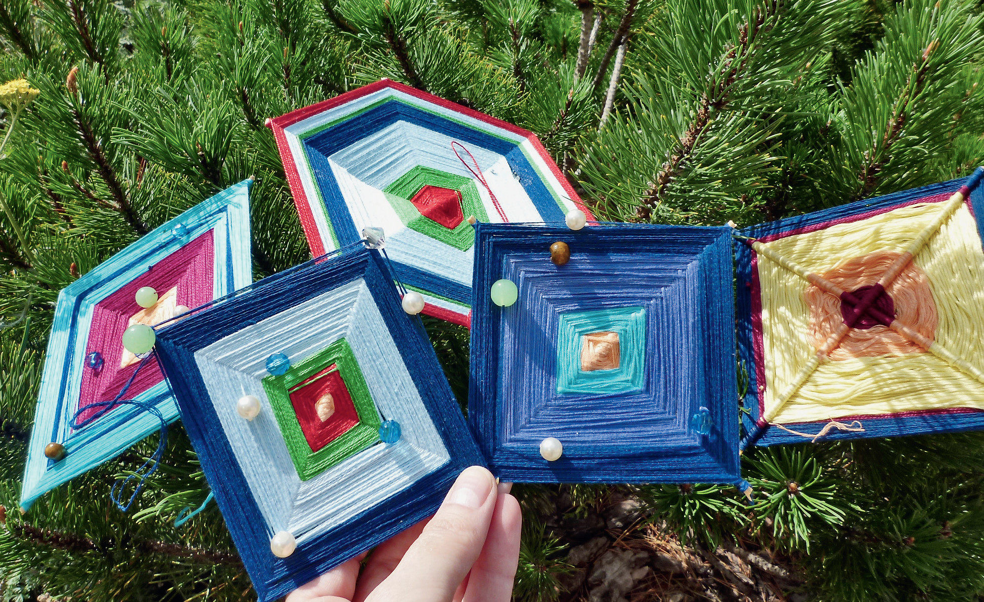 Моя знакомая, Елена Александровна Какорина, подопечная фонда поддержки слепоглухих «Соединение», решила принять участие в творческом конкурсе и попросила меня сфотографировать её работы и оформить заявку. Дело в том, что совсем недавно она начала плести мандалы. Слово «мандала» обозначает «круг» или «окружность», но на самом деле мандала — это квадрат, вписанный в окружность и украшенный множеством декоративных фигур, узоров. Все фигуры и орнаменты, расположенные в мандале, симметричны друг другу. На Востоке мандалы считаются символами святости. Для их изготовления нужны всего лишь деревянные палочки и разноцветные нити. Плюс — фантазия, настроение, вдохновение.