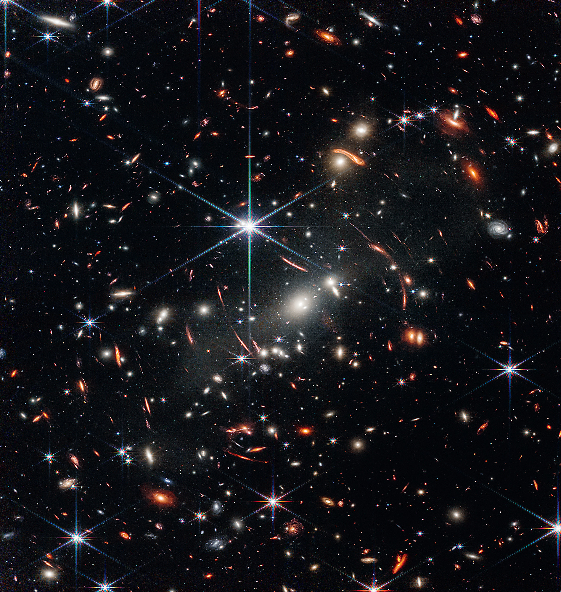 Главным объектом снимка стало скопление галактик SMACS 0723 (ярко-белая эллиптическая галактика в центре и маленькие белые галактики по всему полю), в том виде, в каком оно появилось 4,6 миллиарда лет назад. Огромная масса скопления действует как гравитационная линза, увеличивая и искажая более далёкие галактики, в том числе те, которые возникли, когда Вселенной было меньше миллиарда лет. Это самые чёткие и подробные изображения звёздных скоплений в ранней Вселенной. Гравитационное линзирование проявляется, в частности, в создании зеркальных изображений отдельных галактик, яркими примерами которых служат оранжевые дуги слева и справа от центральной галактики скопления. Каждая зеркальная галактика отобразилась дважды на одной дуге. На изображении видны их яркие ядра, заполненные звёздами, и звёздные скопления по краям.