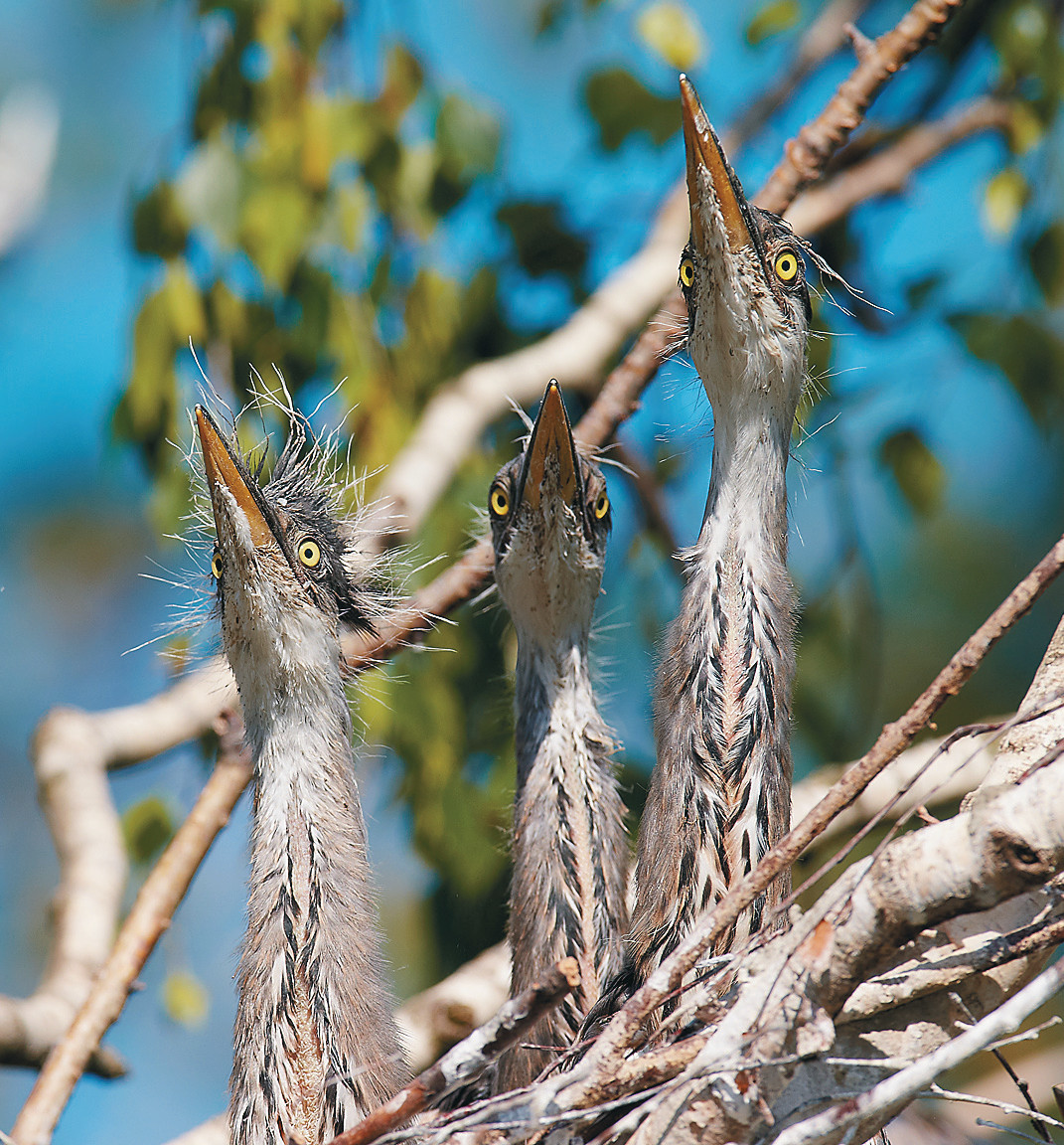 История про цапель-рыбаков началась ещё зимой, когда, построив скрадок на дереве (о всевозможных таких устройствах я писал в статье «В видоискателе — животный мир», см. «Наука и жизнь» № 4, 2021 г.) в самом центре цапельной колонии, я стал очевидцем таинства появления и 131развития новых жизней этих замечательных птиц. Благодаря тому, не побоюсь сказать, фантастическому укрытию появились и фотографии, и новые знания о серых цаплях. И вот, изучая их поведение в гнездовой колонии и видя, что родители регулярно прилетают к вечно голодным цаплятам с добычей, я наметил новую цель: подсмотреть, как же они достигают такой результативности. Через некоторое время на водном перекате озера Маныч-Гудило в Калмыкии коллективом единомышленников было сооружено специальное укрытие, откуда и велось затем наблюдение за невероятным зрелищем.