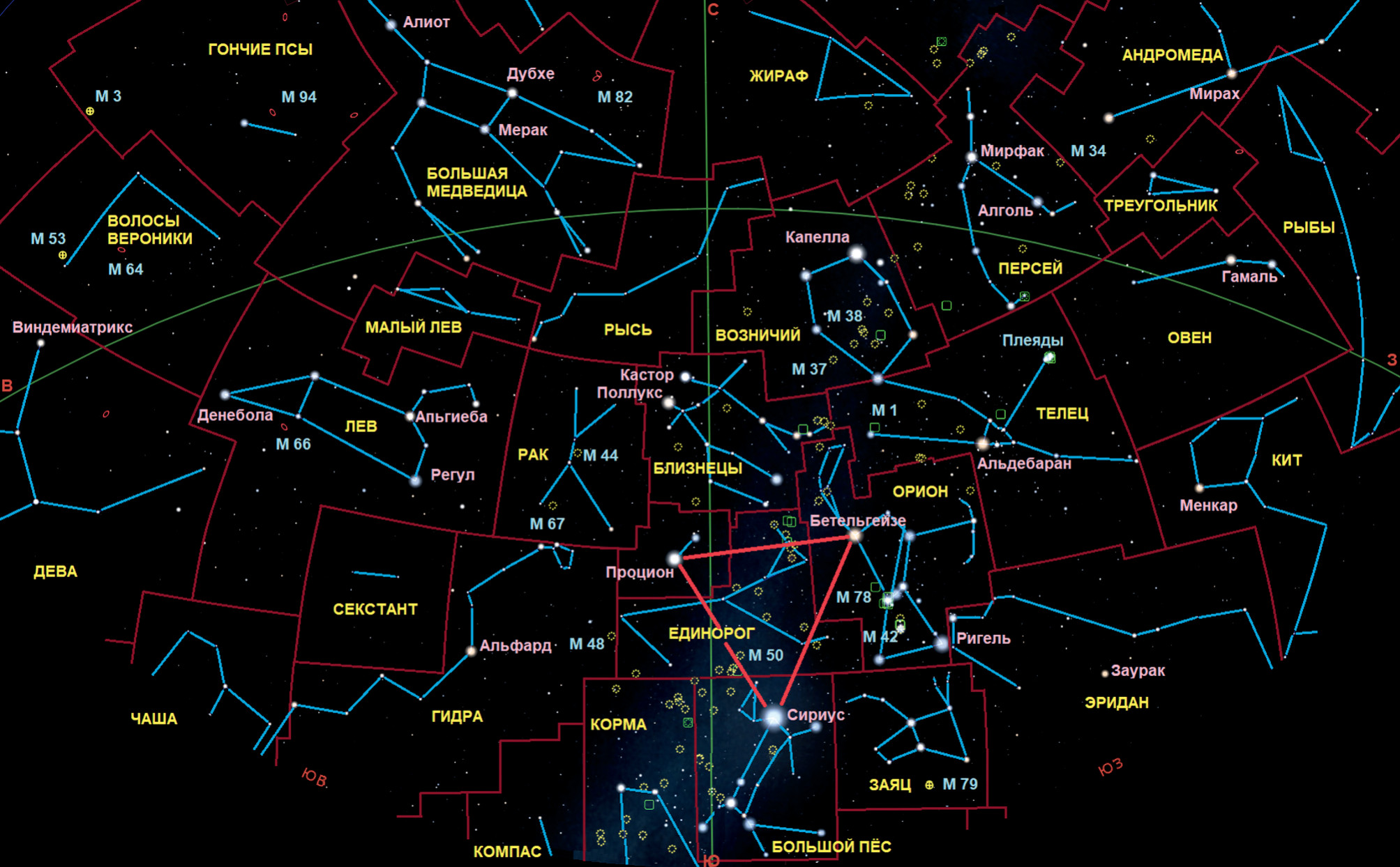 Но вернёмся к Единорогу. Центральная часть созвездия находится внутри Зимнего Треугольника — астеризма, образованного яркими звёздами: сириусом (α Большого Пса; −1,46m), Проционом (α Малого Пса; 0,34m) и Бетельгейзе (α Ориона; 0,0—1,6m), по которым его легко найти. Полностью созвездие видно в центральных и южных районах России. Лучшие условия наблюдения — зима и начало весны, когда оно кульминирует около полуночи.