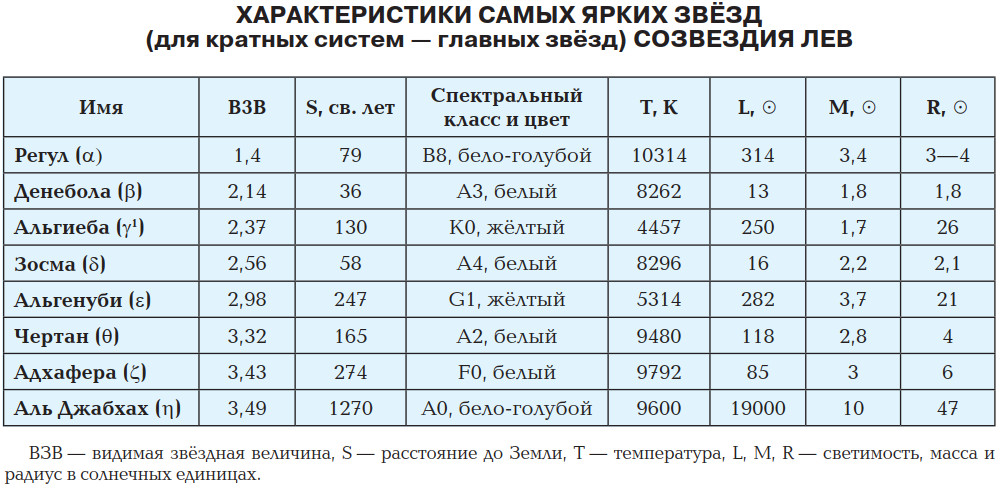 Самая яркая звезда созвездия кажется одиночной, но в действительности — она четверная звёздная система, состоящая из двух пар звёзд. То, что главная звезда α Льва Aa (Регул) — спектроскопическая двойная, было обнаружено совсем недавно, в 2008 году. Её компаньон Ab, вероятно, белый карлик (0,3 M☉; 0,06 R☉; 20 000 K), удалённый всего на 6 R☉, так что увидеть его рядом со столь ярким объектом практически невозможно. Период обращения пары вокруг общего центра масс около 40 дней. До этого считалось, что Регул молод, ему всего 50—100 миллионов лет, что оценивалось по его массе, температуре и светимости. Существование компаньона означает, что возраст системы составляет не менее 1 миллиарда лет, требующихся для формирования белого карлика. Такое расхождение может быть объяснено переносом массы с компаньона на изначально меньший Регул.