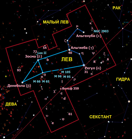 Лев (на латыни Leo) — крупное зодиакальное созвездие, по площади занимающее 12-е место из 88 известных созвездий. Любопытно, что оно могло оказаться значительно больше, если бы не астрономы Нового времени. Во II веке, когда был создан «Альмагест» Клавдия Птолемея, в созвездие входил астеризм Кисточка на хвосте Льва, который в настоящее время стал созвездием Волосы Вероники. Первым так назвал этот астеризм в третьем веке до нашей эры греческий астроном Конон Самосский в честь жены египетского царя Птолемея III, которая отрезала свои прекрасные волосы и поместила их в храме Афродиты в благодарность за победу мужа над государством Селевкидов. Но как новое созвездие его впервые показал в 1536 году немецкий астроном Каспар Вопеллий. А с 1602 года оно было официально включено в каталог Тихо Браге. Кстати, это единственное созвездие, носящее имя реального человека. Также Птолемей относил ко Льву звёзды, которые Ян Гевелий в 1687 году присоединил к введённому им созвездию Малый Лев.
