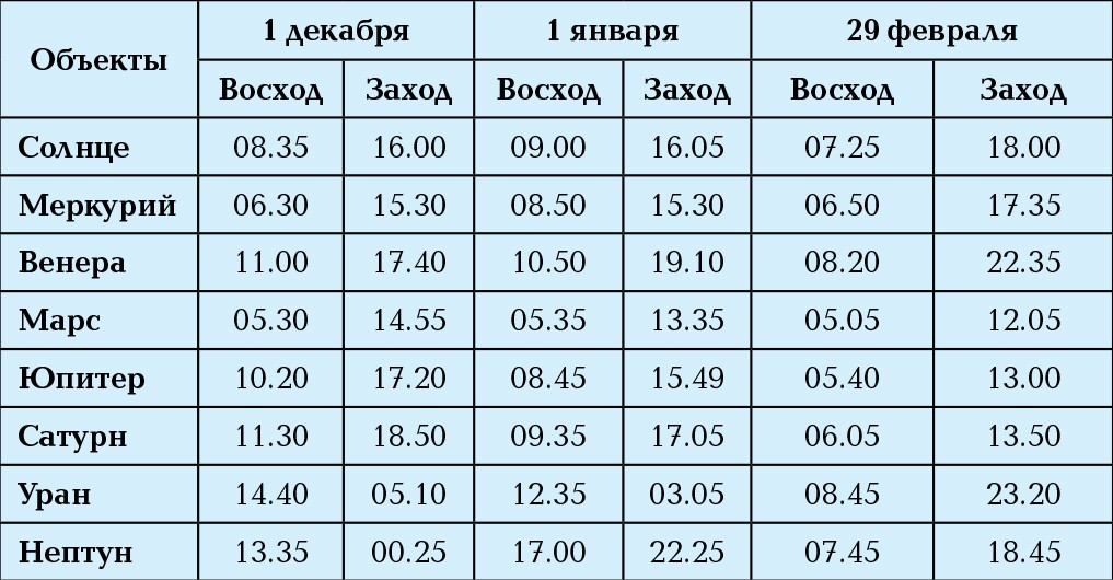 Восход и заход Солнца и планет (округлённо)