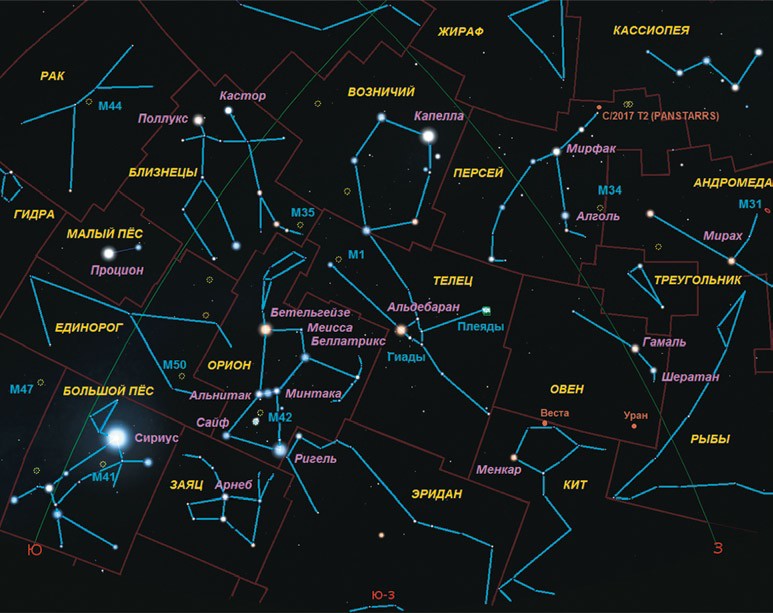 Этой зимой начнётся наилучшее время для наблюдения за долгопериодической кометой C/2017 T2 (PANSTARRS), обнаруженной в 2017 году. Её период около 295 000 лет, так что это наш единственный шанс рассмотреть гостью из глубин Солнечной системы. 1 декабря комету можно найти недалеко от Капеллы (α Возничего, 0m) на продолжении линии Менкалинан (β Возничего, 1,9m) — Капелла. Тогда её блеск будет порядка 10m. 29 декабря произойдёт её первое сближение с Землёй на расстояние около 1,52 а. е. В этот момент блеск составит примерно 9,2m. Найти комету можно будет на границе созвездий Персея и Жирафа, посередине между звёздами Мирфак (α Персея, 1,75m) и CS Жирафа (4,25m). Затем комета продолжит сближение с Солнцем, перемещаясь по созвездиям Персея и Кассиопеи. 10 января она пройдёт недалеко от звезды Мирам (η Персея, 3,75m), а в конце февраля для её поиска можно ориентироваться на звезду Сегин (ε Кассиопеи, 3,35m). В этот момент её блеск возрастёт до 8,8m. Всё это время она будет находиться вблизи зенита.