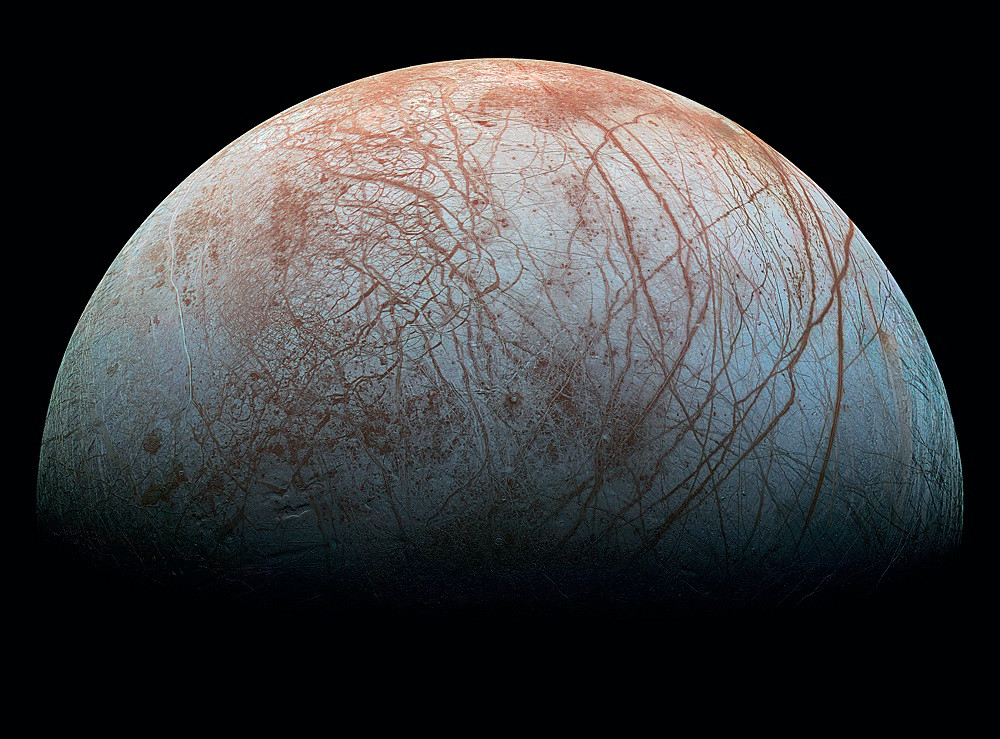 Однако на Европе «не всё гладко», как может показаться на первый взгляд. Её светлая поверхность вдоль и поперёк исчерчена рыжевато-коричневыми полосами. Линии причудливо пересекаются и создают своеобразный абстрактный узор. Но это не просто художества природы — это разломы и трещины в ледяной коре, причём некоторые из них опоясывают Европу почти по кругу. Подобную структуру можно встретить лишь на просторах ледяного покрова Северного Ледовитого океана. Система трещин образовалась на Европе из-за растрескивания коры в результате всё той же внутренней активности. Не стоит близко к ним приближаться, ведь их глубина может достигать сотен метров, а ширина — 20 км!