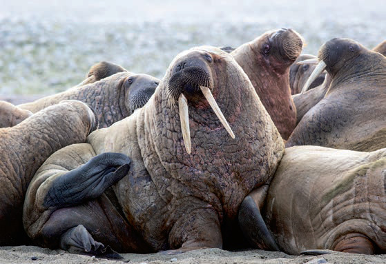 Моржи собираются на лежбищах в безледный период и остаются там до тех пор, пока не сформируется кромка льда. Лежбище — безопасное место, которое подходит для отдыха животных и защиты от главного (и единственного) врага моржа — белого медведя. Обычно по краям лежбища залегают самцы: бивни взрослых особей представляют для медведя серьезную угрозу, самки и молодые особи залегают в центре или ближе к воде.