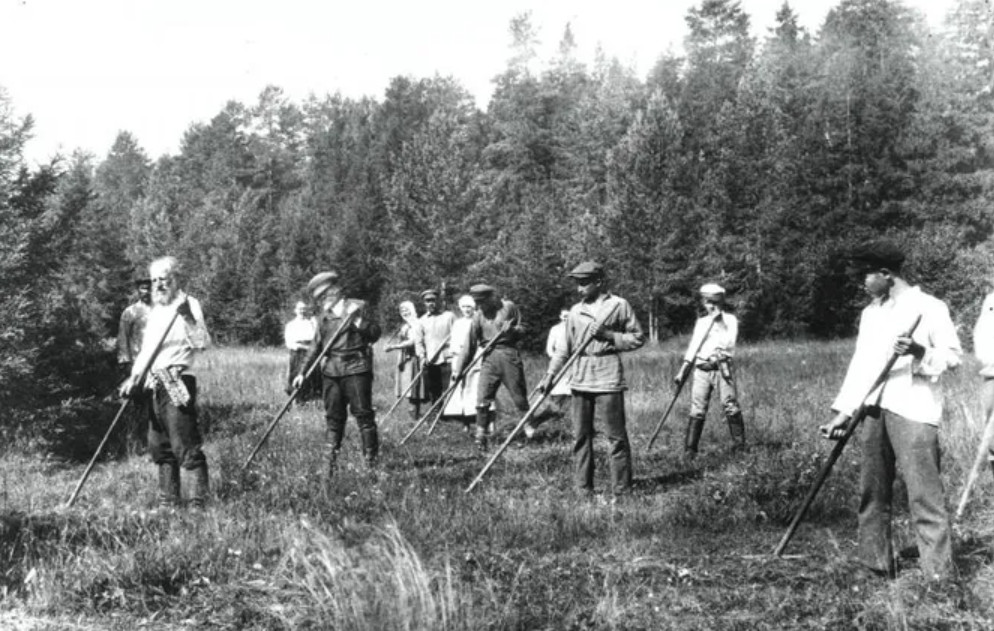 Автор снимка - советский фотограф Петр Оцуп. Предположительно, действие происходит в 20-х годах XX века в деревне Верхняя Троица, Тверская область. Среди крестьян на сенокосе можно разглядеть Михаила Калинина - советского партийного деятеля, на тот момент занимавшего пост номинального главы государства. "Добрый дедушка президент" (так называли всесоюзного старосту в народе) приехал поддержать односельчан.