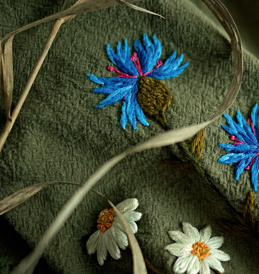 Я неплохо разбираюсь в растениях и обожаю сезон цветения трав, как волны цвета сменяют друг друга, шалфей и таволга – фиолетово-белый, потом подморенник и зверобой – жёлтый. Каждый цветок может нести свои ассоциации. Вот мои заказчицы за этим и приходят. Кто-то просит вышить что-то конкретное, например, из детства в деревне, кто-то, как я, просто любит полевые травы.