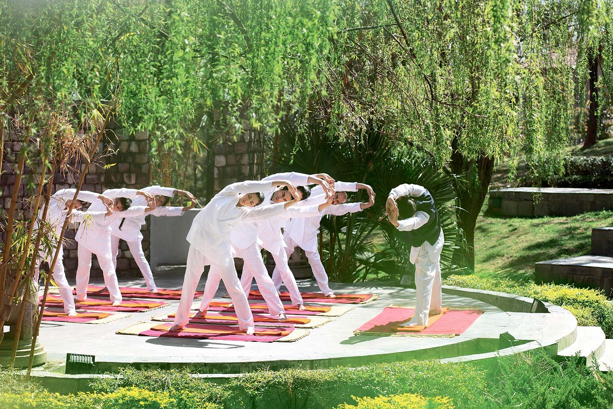 В три часа ночи в Дели уже 30 градусов жары, выходишь из здания аэропорта — как в парную. Нам предстоит шестичасовая дорога до wellness-ретрита Ananda in the Himalayas — на северо-восток страны, к подножию Гималаев, к границе с Тибетом. Современные высотки сменяются типично индийской реальностью: повозки с лошадьми, гудящие тук-туки и мотобайкеры с оранжевыми флагами съезжаются на празднования в честь бога Шивы и великой реки Ганг. Выходить из машины всё еще опасно: влажный жаркий воздух облепляет кожу, как ватное одеяло. Но когда, поднявшись по серпантину, оказываешься перед высокими воротами Ananda, всё меняется. Машина едет по гравийной дорожке мимо дворца Махараджи, а красивые девушки в сари приветствуют: «Добро пожаловать домой». Воздух свежий и чистый, ни следа зноя и духоты. Здесь днем всегда +25, как в Калифорнии.