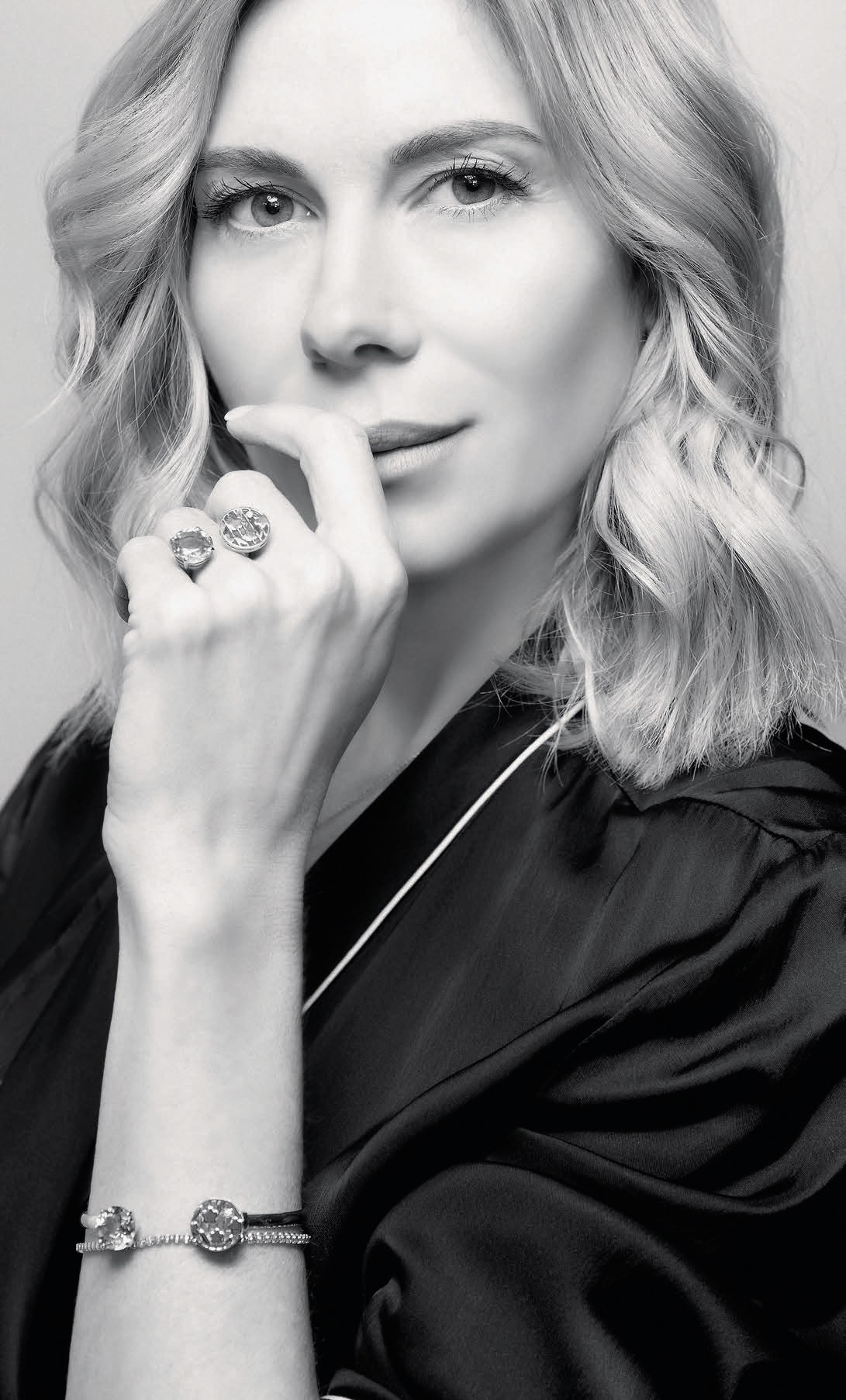 На Анне: костюм Genny, кольцо, браслет из желтого золота с бриллиантом и медовым цитрином, теннисный браслет из желтого золота с бриллиантами — всё Kabarovsky