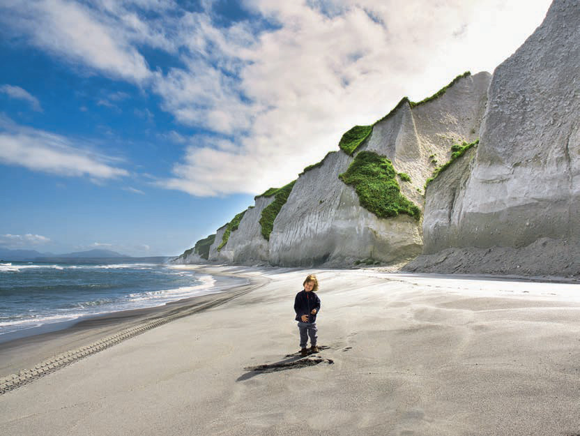 Украшение острова Итуруп Курильской гряды. Суровые, захватывающие пейзажи поражают каждого здесь побывавшего. Редкостной красоты вулканические сооружения находятся в северной части Итурупа, в 20 километрах от Рейдово. Тянутся Белые скалы на 28 километров вдоль побережья залива Простор. Они образованы из легковесной пористой пемзы, появившейся там в результате вулканического извержения. Минерал приобретает различные формы под влиянием ветров, образуя причудливые узоры. У основания скал – черно-белый пляж из микса белых частичек пемзы и черного лавового песка.