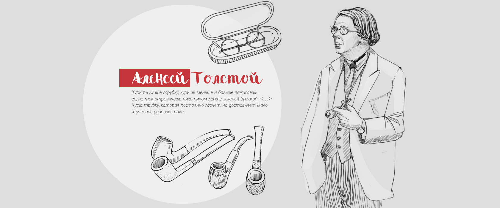С трубкой Алексей Толстой практически не расставался: на многих фотографиях 1930−40-х годов он запечатлен с ней. Трубки были особым миром привычек — он то курил, то в особой задумчивости сопел в трубку, как это делал один из его героев — доктор кукольных наук Карабас-Барабас. И, конечно же, трубка была полноправным героем произведений писателя — рассказов, повестей, романов и очерков. Курит Петр Первый, курят многие герои его военных очерках, смачно раскуривает трубку граф Калиостро. Курение трубки для Толстого было важным ритуалом: «Курить лучше трубку, куришь меньше и больше зажигаешь ее, не так отравляешь никотином легкие жженой бумагой. Табак нужно мешать. Хорошо в него класть нарезанные антоновские яблоки. <…> Папирос во время работы не курю — не люблю дуреть от табаку, не люблю много дыму. Курю трубку, которая постоянно гаснет, но доставляет мало изученное удовольствие».