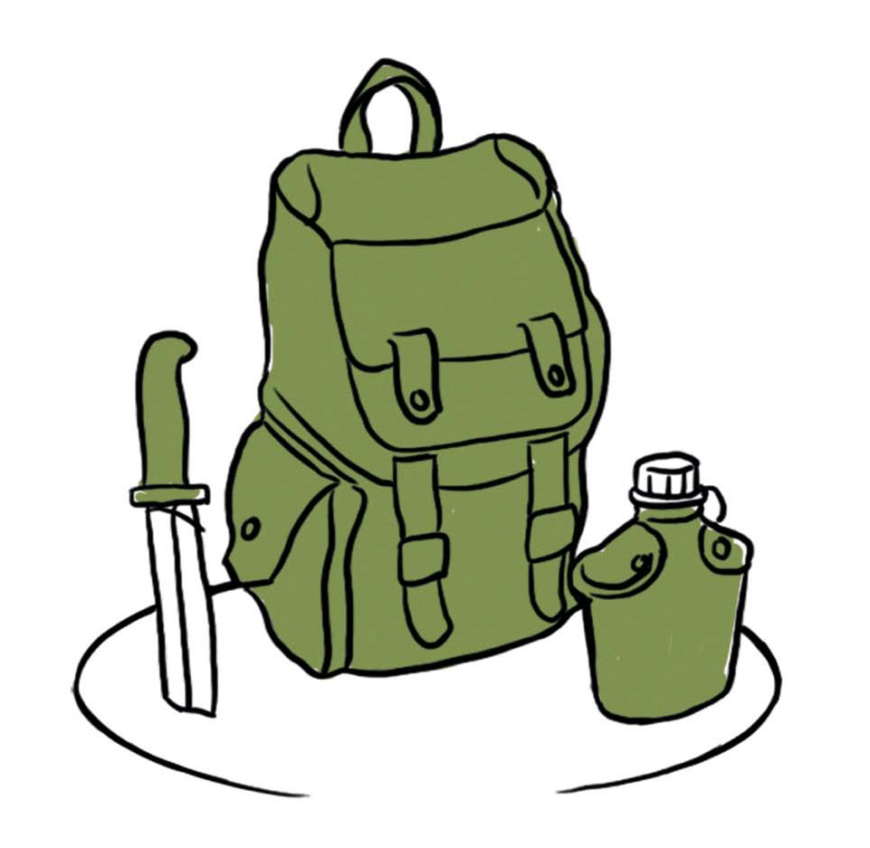 В дикой местности в случае возникновения чрезвычайной ситуации решающими являются пять факторов: прекрасная физическая форма, минимальные знания территории, сноровка, удача и вера в себя. Не важно, идет ли речь об однодневном горном походе или об экспедиции на вершину Эвереста. Наличие правильно подобранной одежды и снаряжения может решить вопрос жизни и смерти. Не нужно перегружать рюкзак, берите лишь то, что вам действительно необходимо: спальный мешок, палатку, кухонные нагревательные и столовые приборы, сухую одежду, водонепроницаемую куртку, аптечку, зажигалку, еду, бутылку для воды, нож. Особенно тщательно выбирайте нож. Те, у которых лезвие и ручка изготовлены из настоящего прочного металла, являются более надежной альтернативой складным ножам. Хотя последние маленькие и практичные, но в качестве кирки и опоры слишком нестабильные. Багаж, который понадобится вам меньше всего, укладывается на дно рюкзака, тяжелые предметы – максимально далеко от спины. Сохранить все действительно сухим поможет упаковка вещей в пластиковые пакеты. В нагруженном виде вес рюкзака не должен превышать четверти массы вашего тела, носите его максимально высоко на своей спине. При коротких остановках не снимайте его – это сэкономит ваши силы, вместо этого используйте его в качестве опоры для спины.