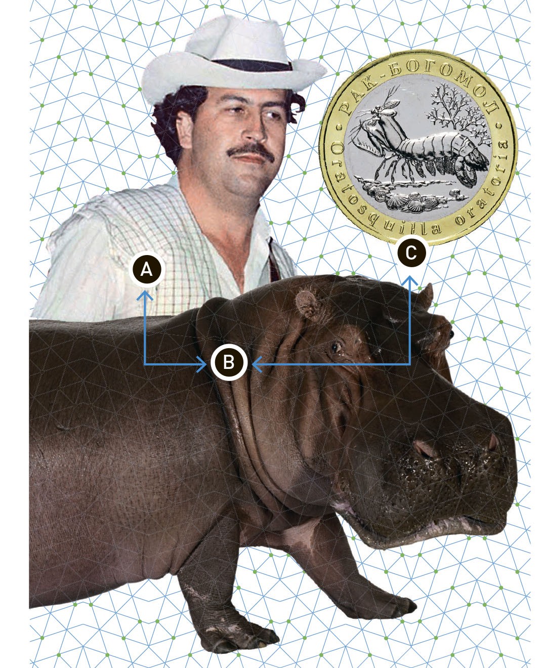 В конце 1980-х Медельинский кокаиновый картель достиг вершины криминального могущества и богатства. Любимой резиденцией его главы Пабло Эскобара [A] была гасиенда «Неаполь». Здесь наркобарон устроил аэродром, арену для боя быков, гоночный трек и даже зоопарк, куда доставили экзотических животных. После смерти Эскобара и краха его организации звери остались без присмотра, многие погибли. Однако четверо бегемотов, доставленных из Африки, чувствовали себя отлично, и к 2018 году популяция достигла, по разным оценкам, от 50 до 70 особей. Для здешних экосистем бегемоты оказались опасным инвазивным видом. Однако расселить их не удается до сих пор: