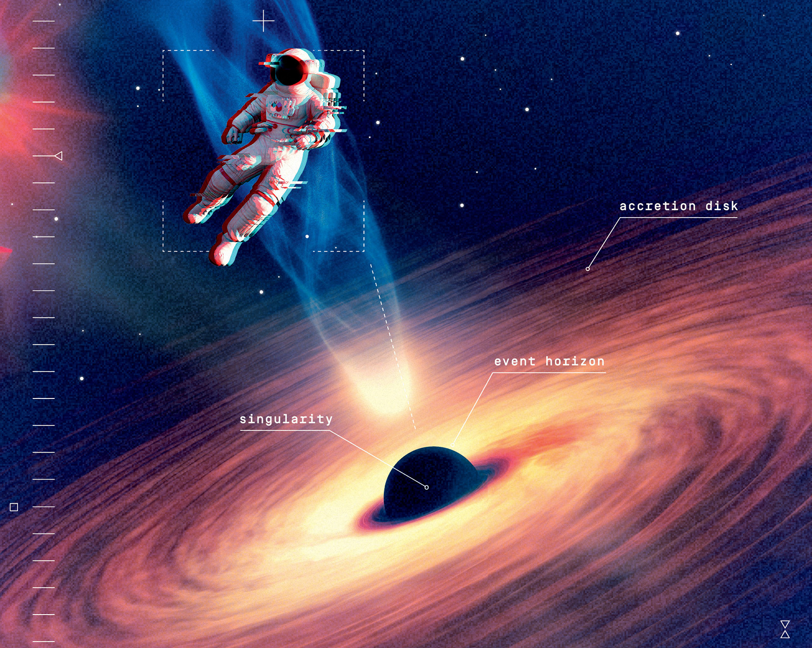 Астрофизик из колумбийского университета Жанна Левин сразу пояснила: чтобы выжить достаточное время, стоит выбрать черную дыру покрупнее. Если вы падаете в дыру, до пустим, 100-километрового радиуса, вы сразу окажетесь чересчур близко к центральной сингулярности, да и изменения гравитационного поля будут нарастать так резко, что любые объекты подвергнутся спагеттификации – растяжению и деформации с полным разрушением. Именно поэтому для визита безопаснее найти сверхмассивную черную дыру, такую как М87*, набирающую больше трех миллионов солнц. Го ризонт событий М87* превышает 10 млрд км, и его пересечение, по выражению Жанны Левин, будет «таким же незаметным, как шаг в тень дерева». Вы просто вплывете за него и какое-то время продолжите двигаться дальше. Как замечает Левин, в самых крупных черных дырах могут пройти годы, прежде чем объект достигнет центра.