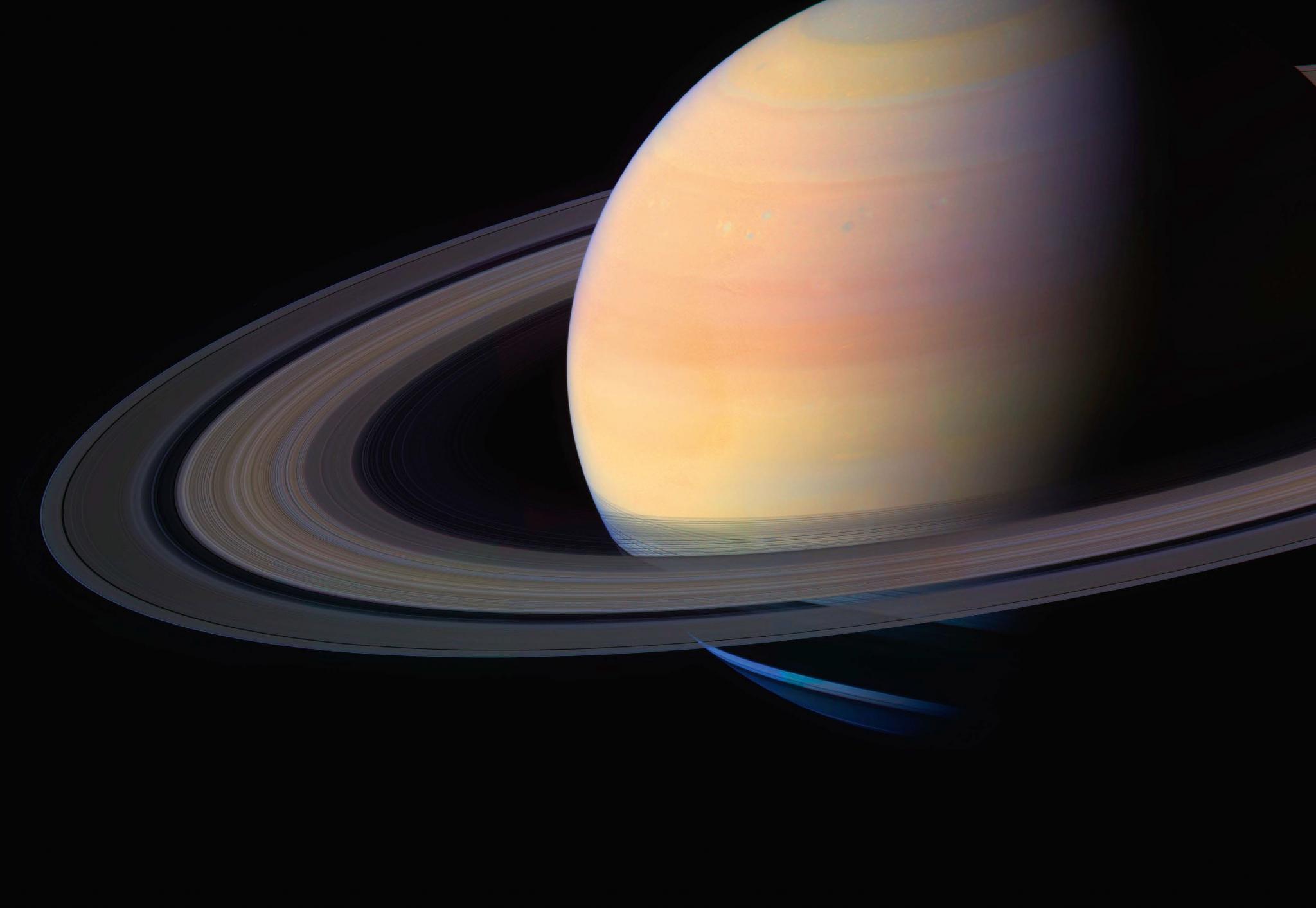 Газовый гигант с системой ледяных колец и многочисленными спутниками. В 95 раз тяжелее Земли и в 9,5 раза дальше от Солнца, местный год длится 29,4 наших лет. Состоит в основном из водорода, средняя плотность меньше воды (0,69 г/см3). Очень бурная атмосфера (ветры на экваторе могут дуть быстрее 500 км/ч) и мощное магнитное поле, создающее полярные сияния. Cassini совершил 294 оборота вокруг планеты.