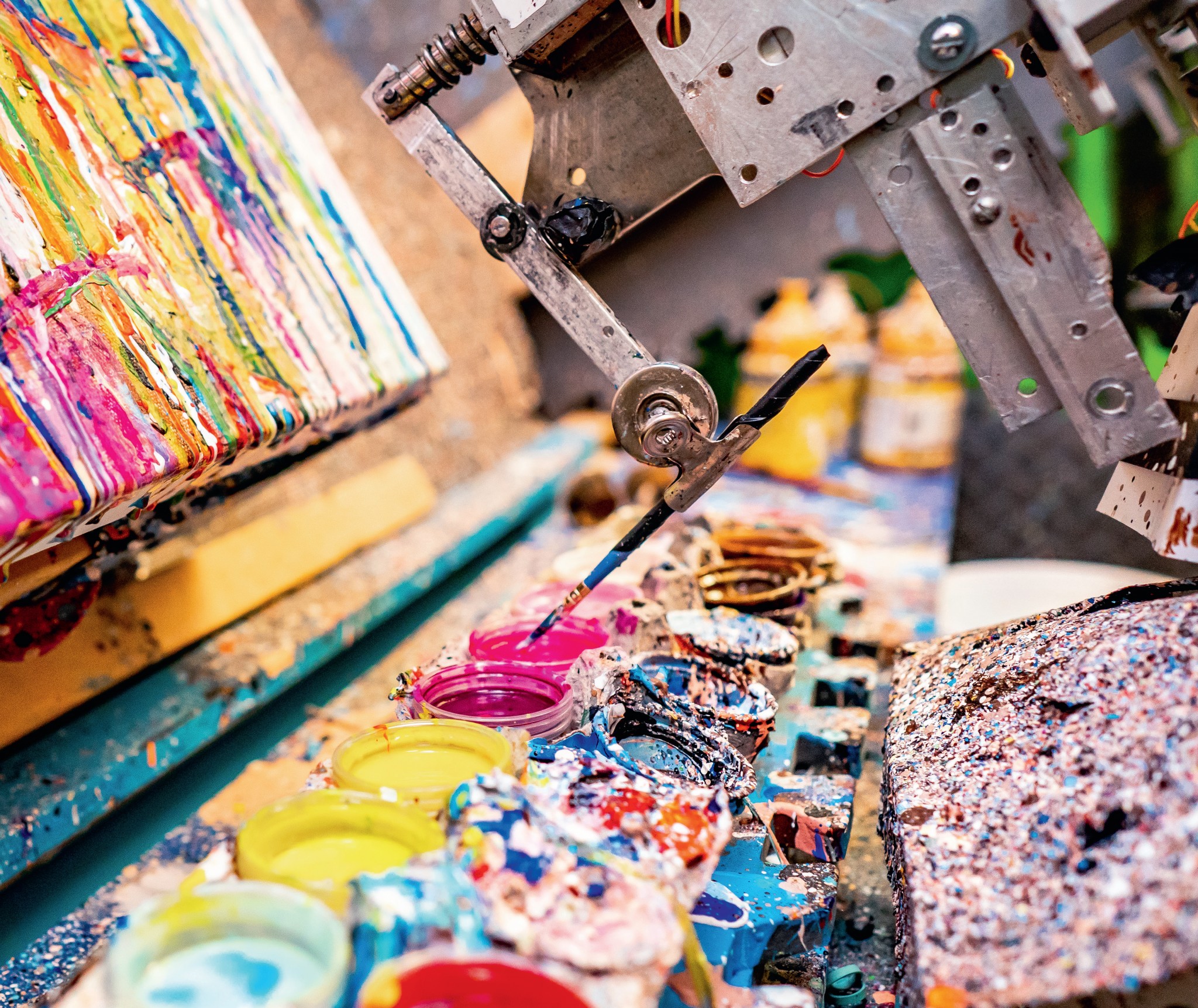 Сейчас в лаборатории-мастерской Пиндара ван Армана десять роботов: пять рук-манипуляторов и пять координатных XY-столов; когда мы звоним, чтобы взять интервью, Пиндар как раз едет покупать одиннадцатую машину. «Мозг» на всех роботов один – искусственный интеллект CloudPainter, над которым Пиндар работает уже тринадцать лет. Робохудожник прошел долгий путь от принтера с кисточкой до механизма, способного написать портрет человека, которого никогда не видел.