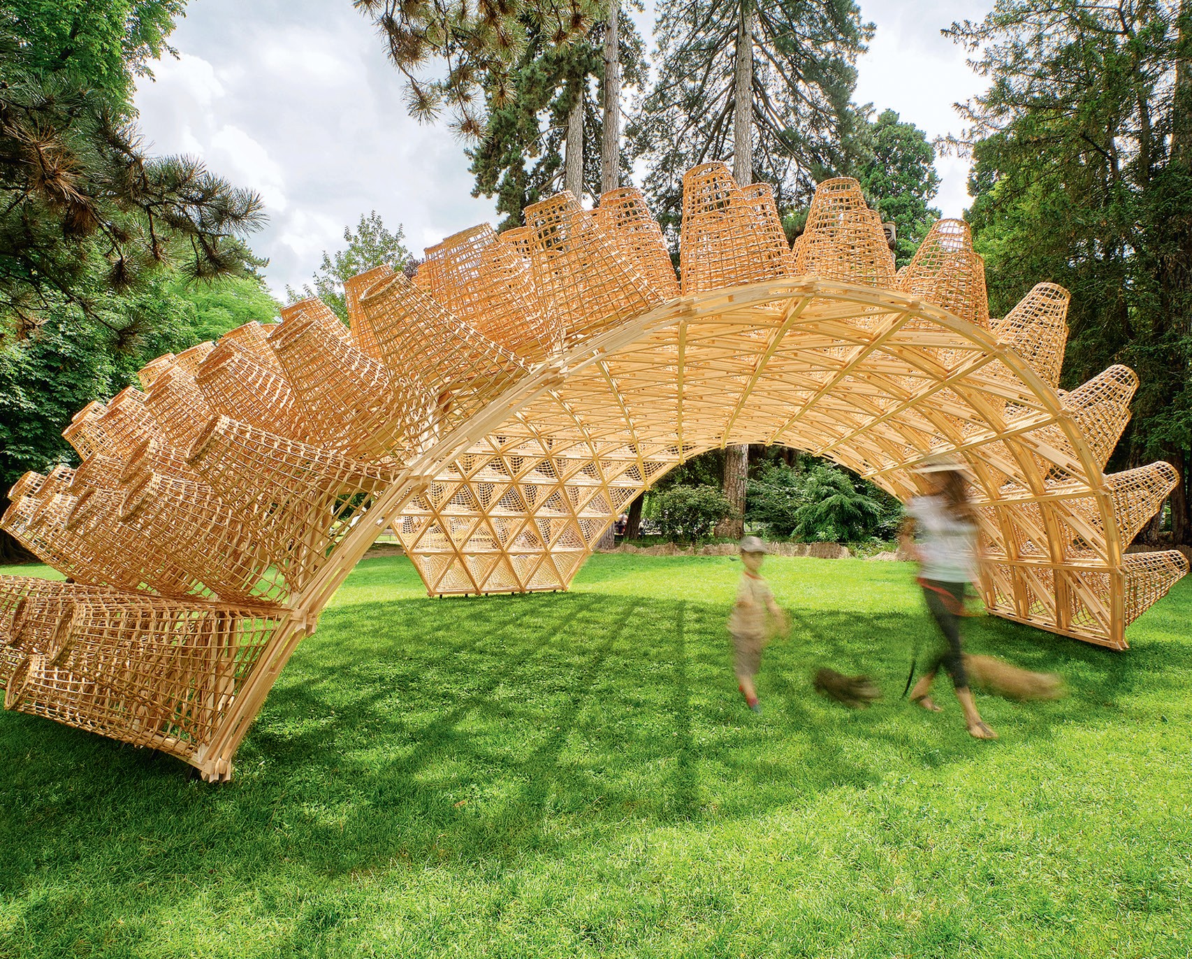 ПЛЕТЕНЫЙ ПАВИЛЬОН (The Wicker Pavillion) был представлен латвийским архитектурным бюро DJA на ландшафтном фестивале Annecy Paysages во французском городе Анси. По замыслу дизайнеров, инсталляция должна символизировать единство современных архитектурных технологий и традиций сельского ремесла. Ажурный облик строению придают несущая структура из сосновых досок, соединенных как сеть геокупола, и установленные сверху корзины, созданные руками латышских