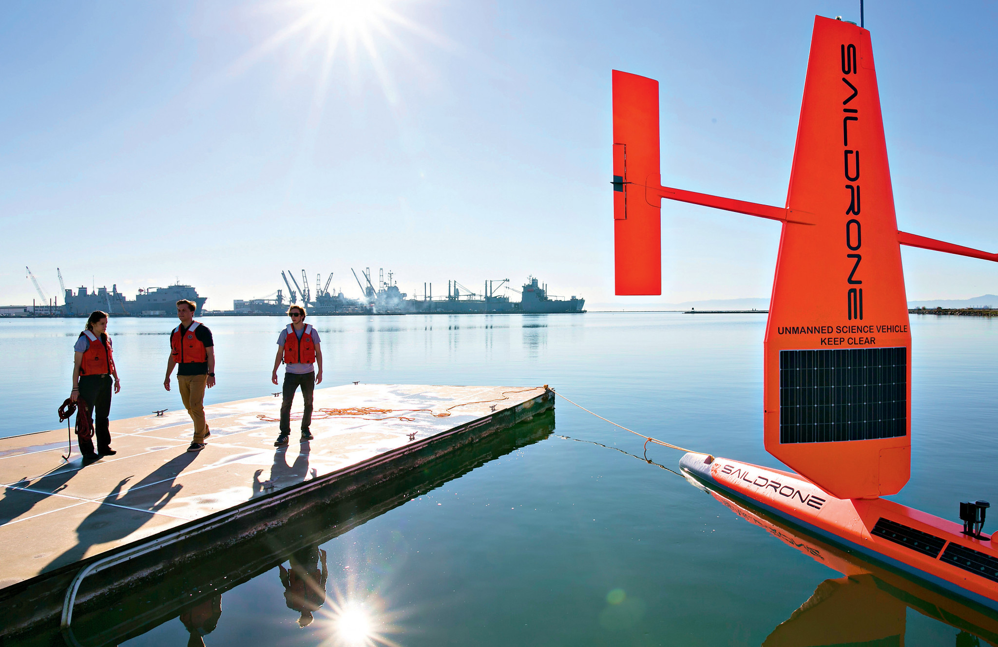 Компания Saildrone (США) создала настоящий научный спутник, только не для околоземной орбиты, а для работы в океане. Это плавучий дрон, оснащенный высокотехнологичным парусом-крылом. Им управляет компьютер с помощью аэродинамического руля. На борту огромное количество сенсоров для локации водной толщи, слежения за морской фауной, измерения параметров воды и воздуха. Данные передаются на контрольный пункт через спутник в реальном времени. Вся электроника питается энергией от солнечных батарей. На сегодня построены и работают в океане уже несколько десятков парусных дронов. В сутки каждый из них проходит до 100 км.