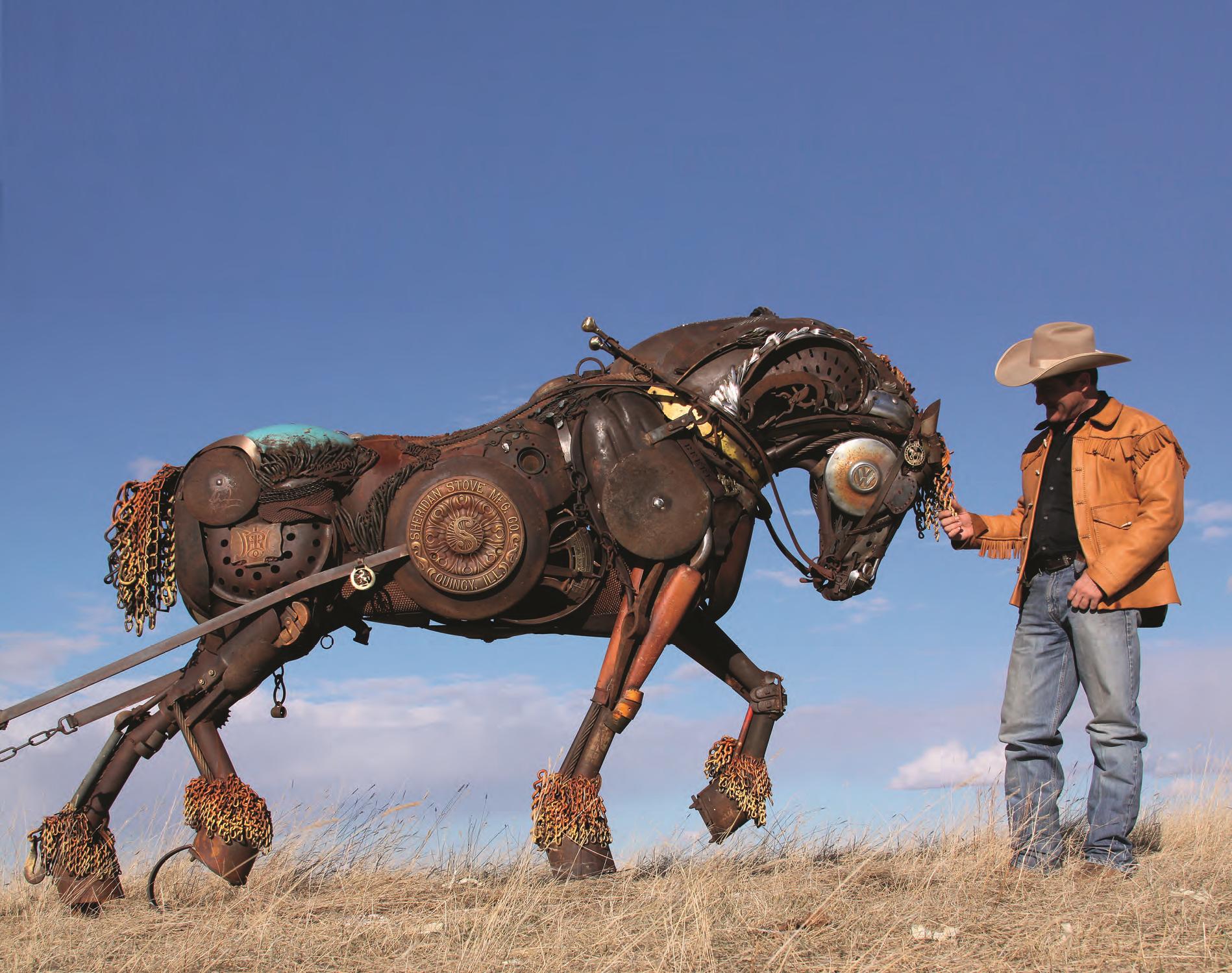 Лошади остаются одним из символов этих мест, а порода морган – гордостью всего Среднего Запада. Это одна из первых пород, выведенных в Северной Америке, красивая, универсальная, подходящая и для работы в поле, и для битвы. В годы Гражданской войны в США ее использовали и конфедераты, и южане – как ездовых, упряжных и кавалерийских лошадей. Упряжным конем служил и легендарный Блэк Хоук, производитель, ставший родоначальником целой ветви морганов и в лучшие годы пробегавший с повозкой по 50 миль ежедневно. Да вот он – полтора века спустя – в грубом металле скульптуры. «“Блэк Хоук” – наверное, одна из самых важных моих работ, – рассказал нам Джон Лопес. – Это “рабочая лошадка”, тянущая плуг: голова опущена, чувствуется, что конь вкладывает в труд весь свой вес... Скульптура вызвала большой отклик у публики, сейчас она стоит в Нью-Гэмпшире, у входа на фермерский рынок».