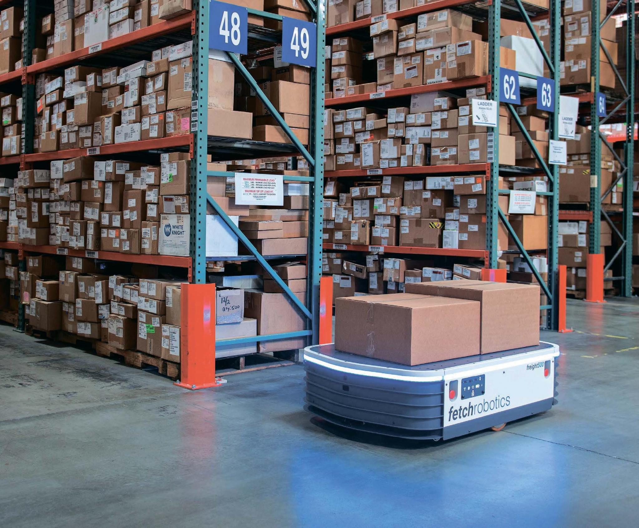 Менее чем за полтора года калифорнийская компания Fetch Robotics собрала почти 50 млн долларов инвестиций: стартап основан выходцами из знаменитой группы Willow Garage во главе с Мелани Вайс. Разработанная ими роботизированная система складской логистики включает подвижные платформы Freight разной грузоподъемности, развивающие до 5,5 км/ч. Они могут следовать за человеком, помогая ему, или принимать товары, спущенные с полок робогрузчиками Hmishelf, манипуляторы которых способны брать до 6 кг груза, действуя на высоте до 2 м. Машины ориентируются по заранее подготовленной карте, используя камеры и лазерные дальномеры, подзаряжаются самостоятельно и готовы работать без выходных и праздничных дней.
