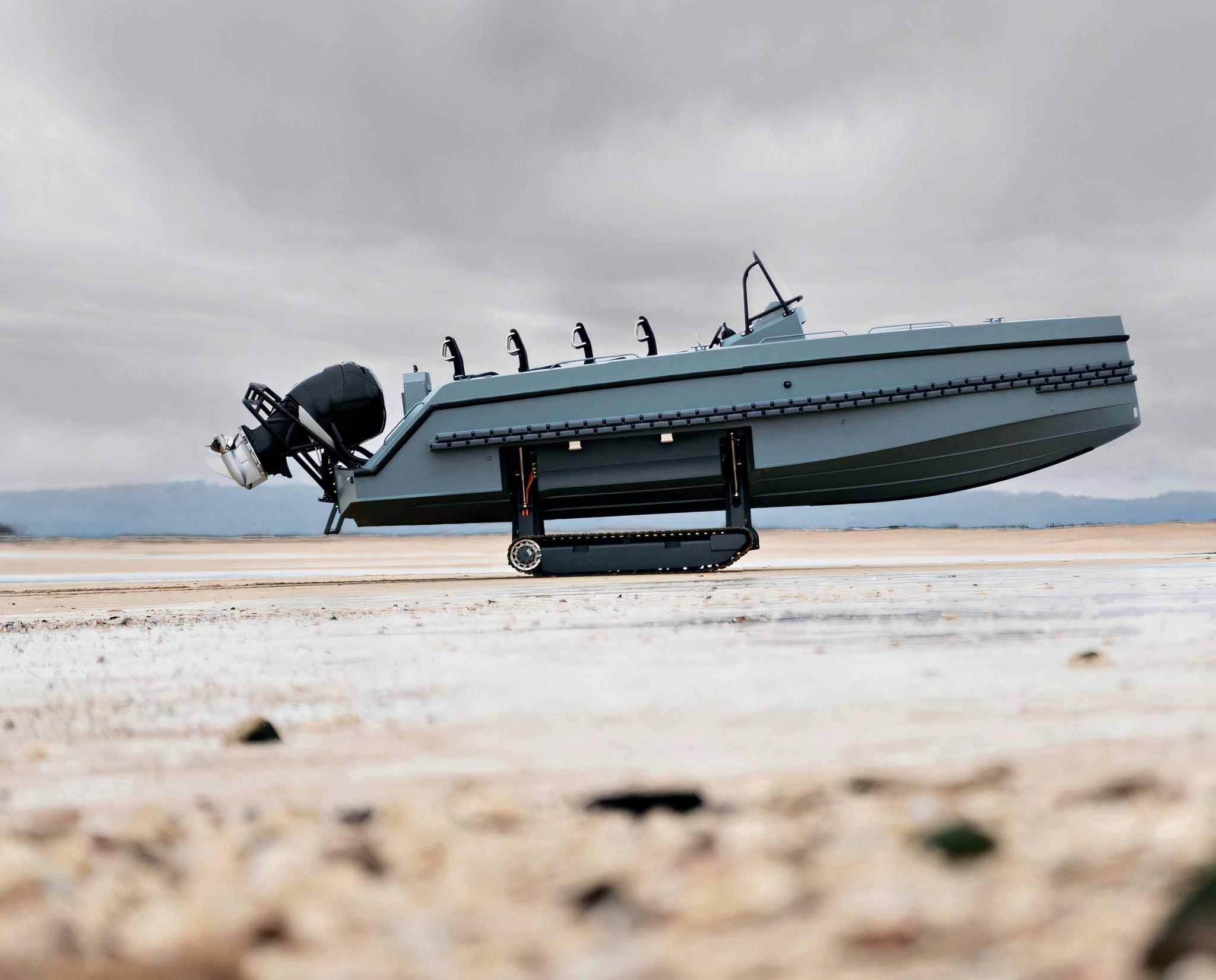 Кораблестроители из французской компании Iguana работают над катером-амфибией с рекордной скоростью передвижения. Установленные на этой надувной лодке с жестким днищем двигатели могут похвастаться общей мощностью 900 лошадиных сил. Разработчики обещают, что Iguana Pro сможет развивать в воде до 55 узлов (102 км/ч). Для сравнения: текущий рекорд скорости для амфибий – 52 узла – был установлен прототипом WaterCar Panther в 2010 году. На суше «игуана» не будет отличаться большой резвостью. Однако на скоростное передвижение по земле катер и не рассчитан: пара вы движных штанг с кевларовыми гусеницами предназначена, скорее, для переползания через препятствия между открытыми водоемами и быстрого спуска на воду практически в любом неподготовленном месте. Гусеничная платформа позволяет преодолевать даже подъемы с уклоном до 40 градусов. Ожидается, что Iguana Pro будет поставляться в двух модификациях: шестиместной для военных пользователей и двухместной для развлекающихся гражданских.
