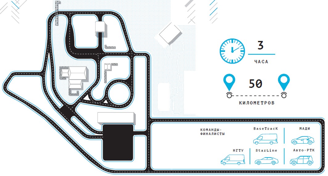 Стандартный профиль поездки из ближайшего Подмосковья в Москву – это 50 км за 3 часа: по статистике, водитель в среднем проезжает около 25 км по загородным трассам, 20 км по городу и еще 5 км простаивает в городских пробках. Однако проводить испытания беспилотного транспортного средства на дорогах общего пользования без оператора запрещено. В России для этого есть всего один подходящий сертифицированный полигон – в НАМИ (Центральный научно-исследовательский автомобильный и автомоторный институт) в Дмитрове, трассу которого все равно пришлось сильно доработать под требования конкурса. Маршрут спроектировали в соответствии со всеми ГОСТами. Это была ювелирная работа – вписать в небольшой кусочек земли максимальное количество элементов дорожной инфраструктуры: светофоры с системой управления, имитацию железнодорожного переезда и тоннеля, круг, «лежачие полицейские», комплекс имитации движения пешеходов, который был разработан специально для конкурса. Предложенный участникам маршрут движения и время его прохождения сначала были смоделированы на цифровом двойнике трассы, а затем вживую опробован организаторами. «Мы с коллегами катались по полигону в течение примерно получаса. Честно скажу: темп, который мы предложили выдержать беспилотникам, не такой уж высокий – по знакомому маршруту мы обычно ездим быстрее, – говорит Константин Кайсин. – Но мы на себе почувствовали другую проблему: из-за высокой плотности элементов дорожной инфраструктуры необходимо постоянно быть максимально сконцентрированным. Уже через десять минут начинаешь уставать, отвлекаться и ненароком можешь и правила нарушить. А вот беспилотник усталости не знает». Еще одна задача, которую предстояло решить разработчикам, – это имитация других водителей, участников движения. Обычные машины для этого не годились: движение на одном участке с полностью автономными автомобилями считается повышенно опасным, поэтому требовалось обеспечить дополнительную защиту водителей. Нашли выход в союзе с раллийными командами: только в автомобили, участвующие в ралли, встроен необходимый каркас безопасности. Водители раллийных автомобилей выполнили действительно сложную работу: ехать с тяжелым спортивным сцеплением несколько часов в рваном неспешном режиме среди беспилотников реально трудно. Не обошлось и без неожиданностей: на некоторых спортивных машинах стояли прямоточные выхлопные системы, и облака выхлопных газов некоторые беспилотники детектировали как препятствия, которые не могли отсеять стандартные фильтры. Это является еще одной особенностью минусовой температуры на дорогах и, естественно, встречается повсеместно на территории России в зимнее время.