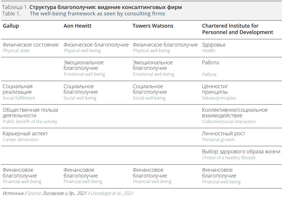 Консалтинговые компании, которые специализируются в сфере корпоративного благополучия, используют собственные модели (Таблица 1).