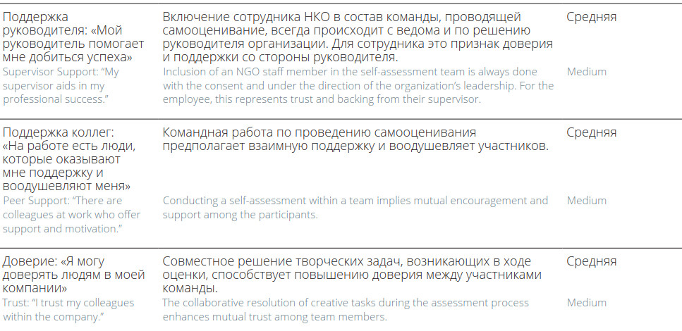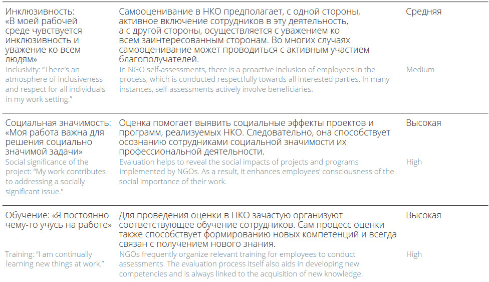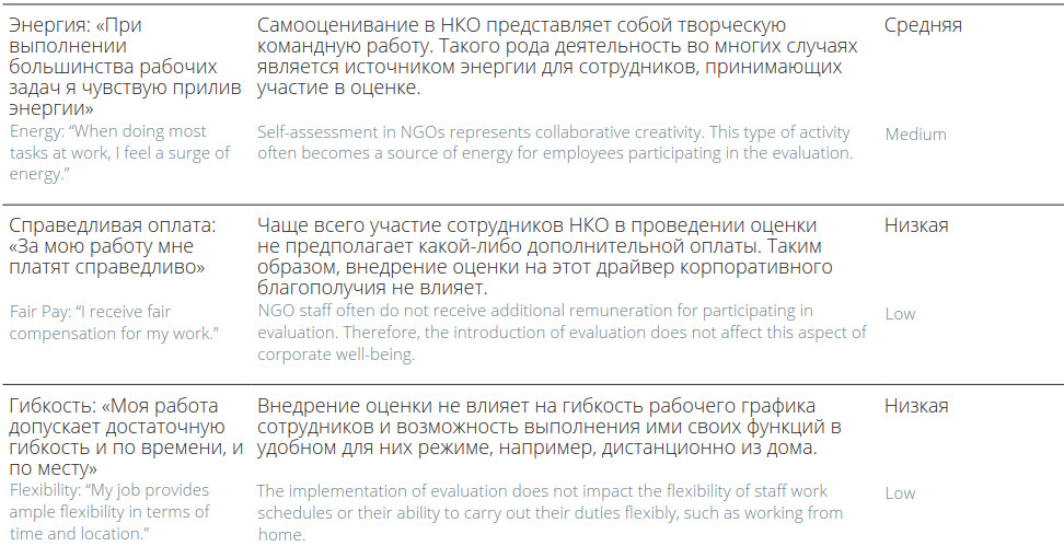 Наш опыт свидетельствует о том, что полномасштабное внедрение оценки в деятельность НКО может позитивно влиять на благополучие сотрудников. Наиболее вероятно проявление такого влияния на следующие составляющие благополучия: достижения («я достигаю большинства своих целей на работе»), социальная значимость («моя работа важна для решения социально значимой задачи»), обучение («я постоянно чему-то учусь на работе»).